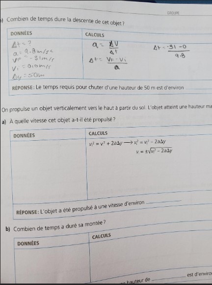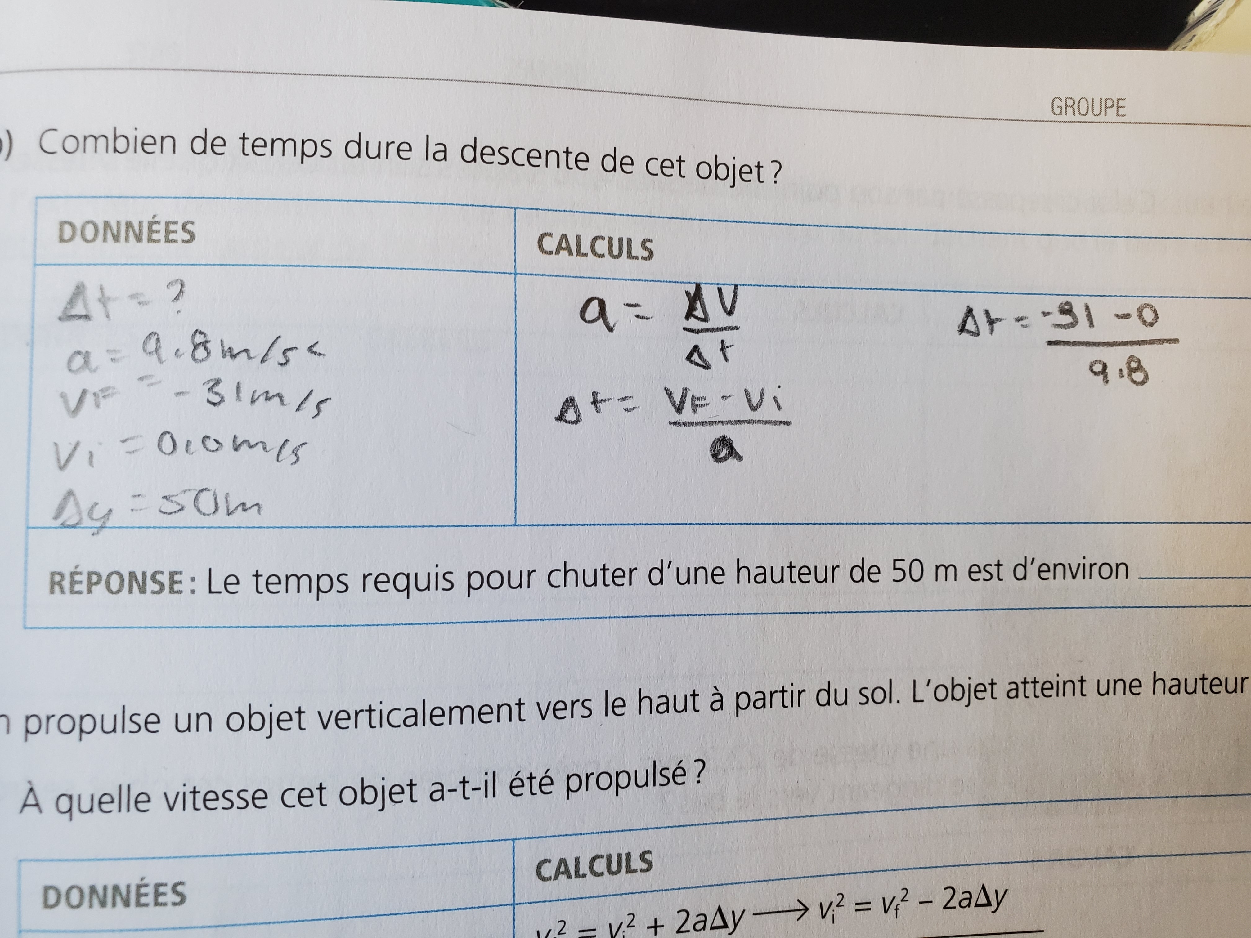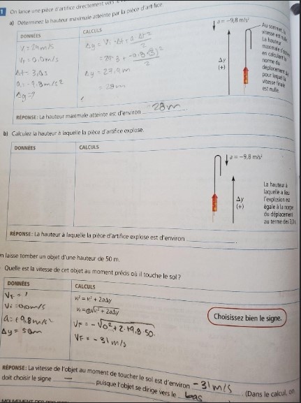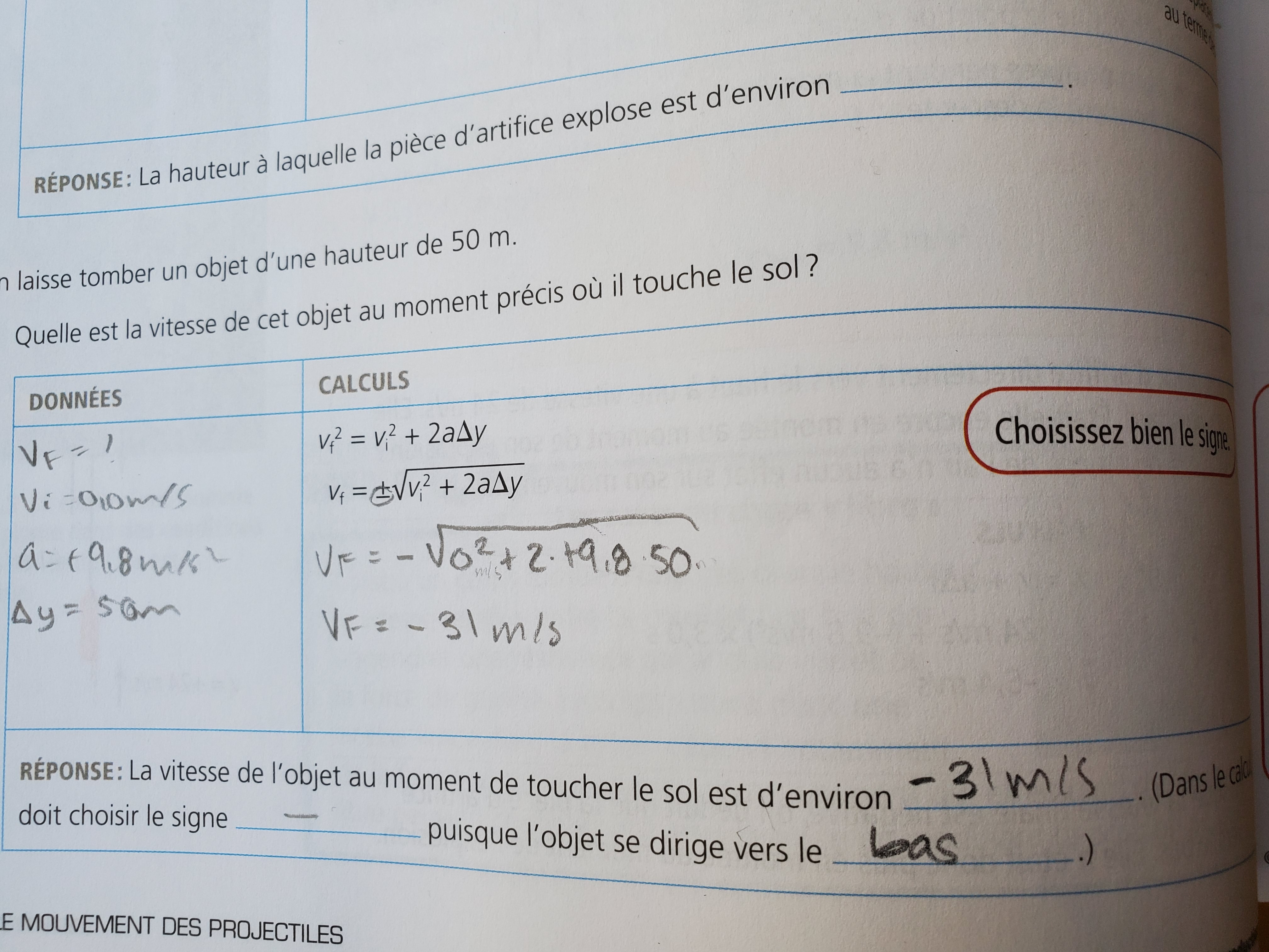 #2. Je ne sais pas quels signes mettre... pour moi, y = 50m, Vi = 0.0m/s et on m'a dit que a = -9.8m/s2. Sauf que si je mets ces chiffres dans ma racine carrée, j'ai une racine négative. Donc je change a en positif, mais ma vitesse est de -31 m/s (je crois, vu que l'objet va vers le bas?).