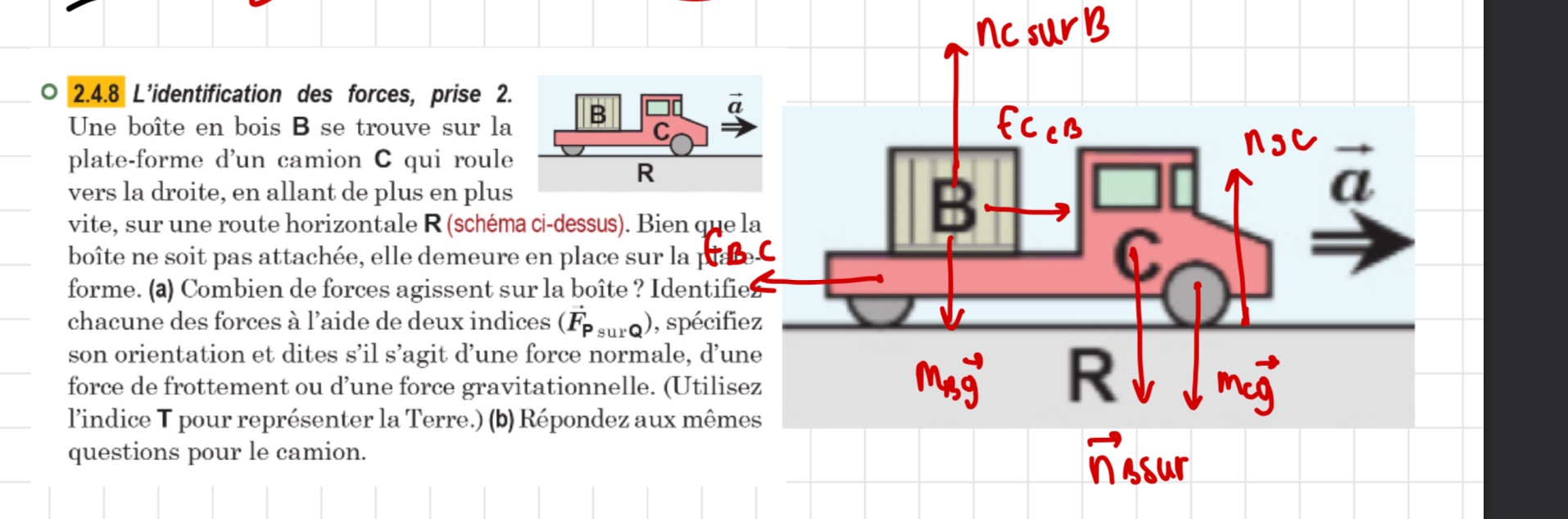Postsecondaire • 1aBonsoir, dans le corrigé de cet exercice on dit que pour C il y a une force de traction exercée de R sur C vers la droite. Pourquoi est-ce cela? Et pourquoi est elle orientée vers la droite? Merci, bonne soirée.
