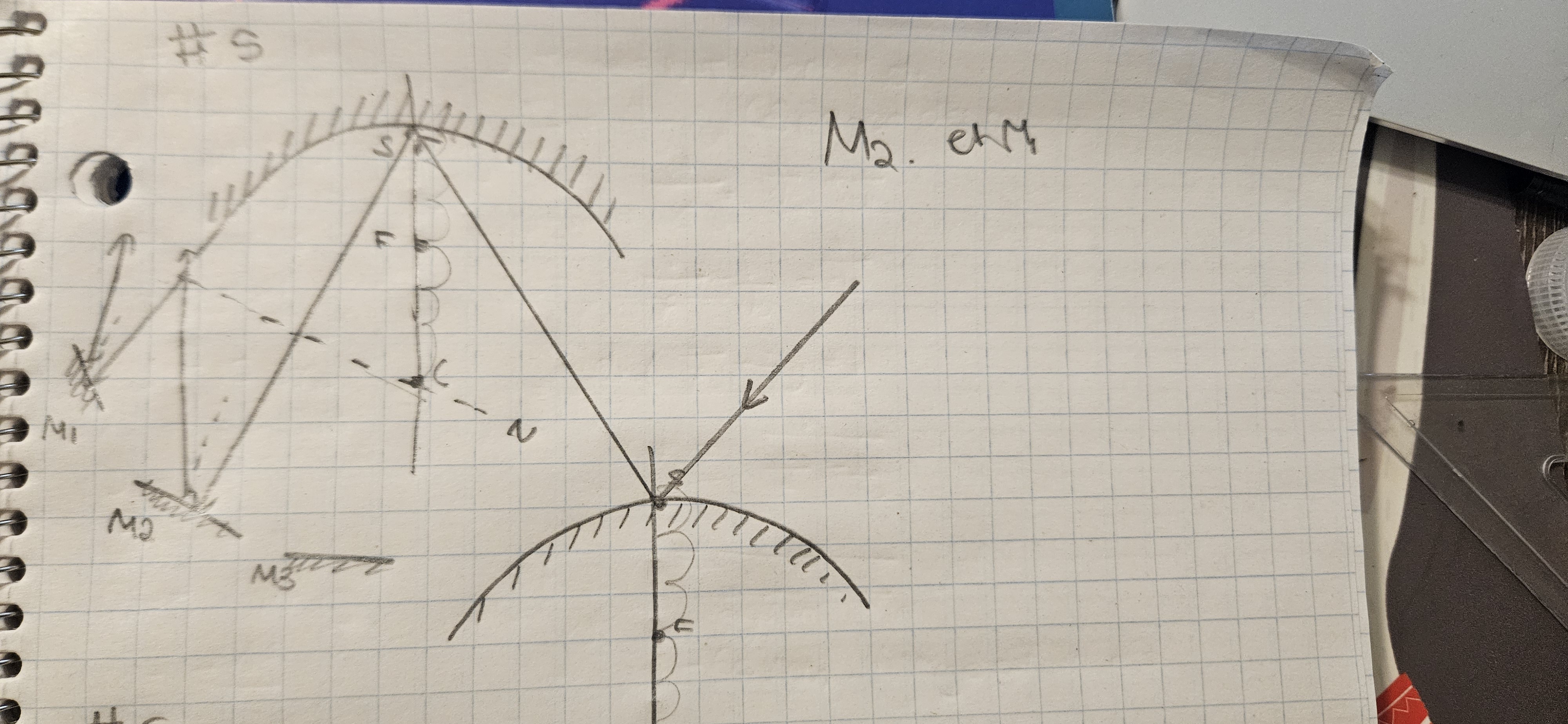 Ce qui m'inquiète le plus c'est que dans le corrigé ça dit juste M2 et non M1, ainsi, je ne suis pas sûre de comprendre pourquoi... pourriez vous m'aider à cibler mon erreur? Est-ce la normale qui est mal faite ou l'angle d'incidence n'est pas égal a l'angle de réflexion du M2? Merci!