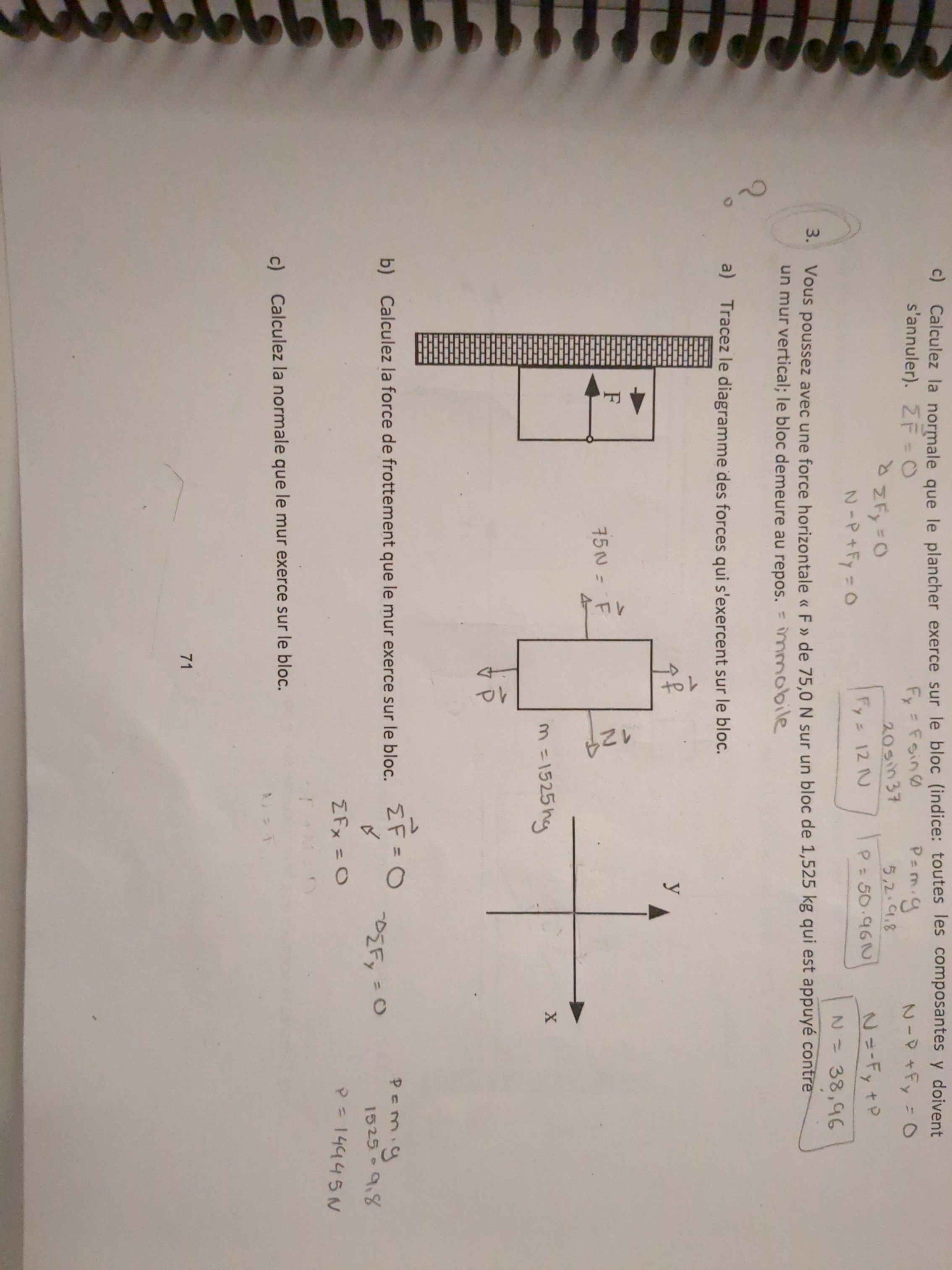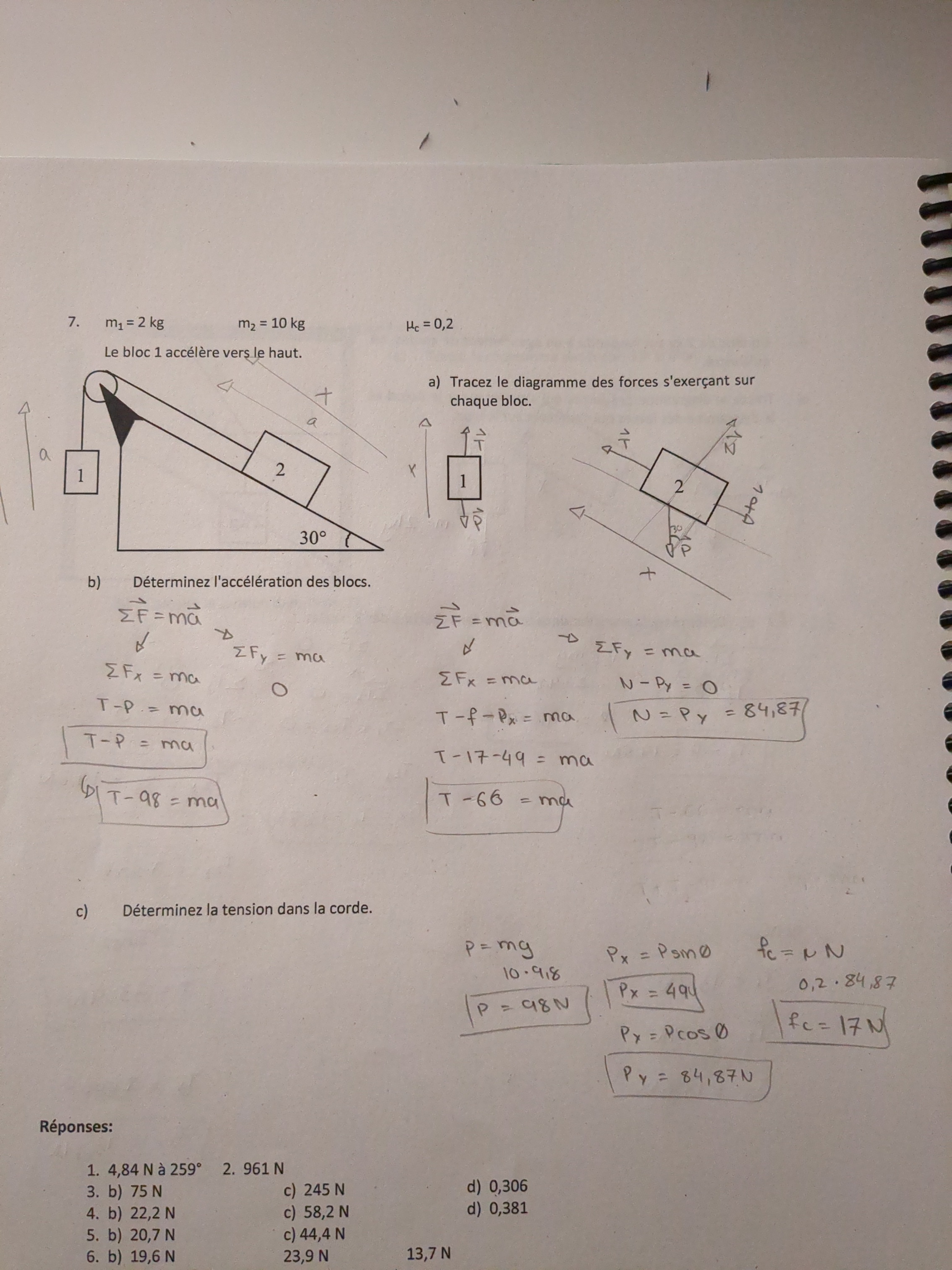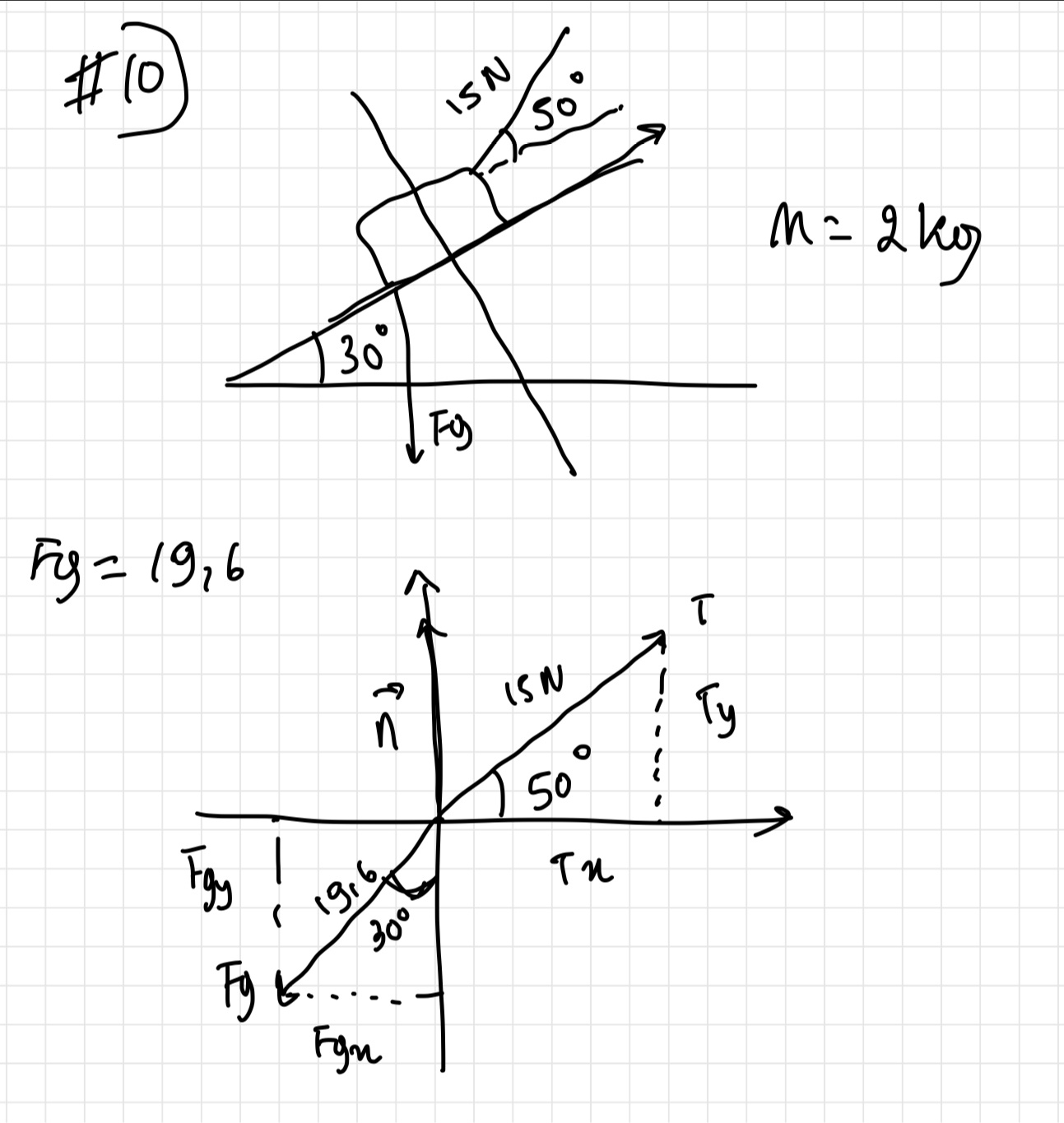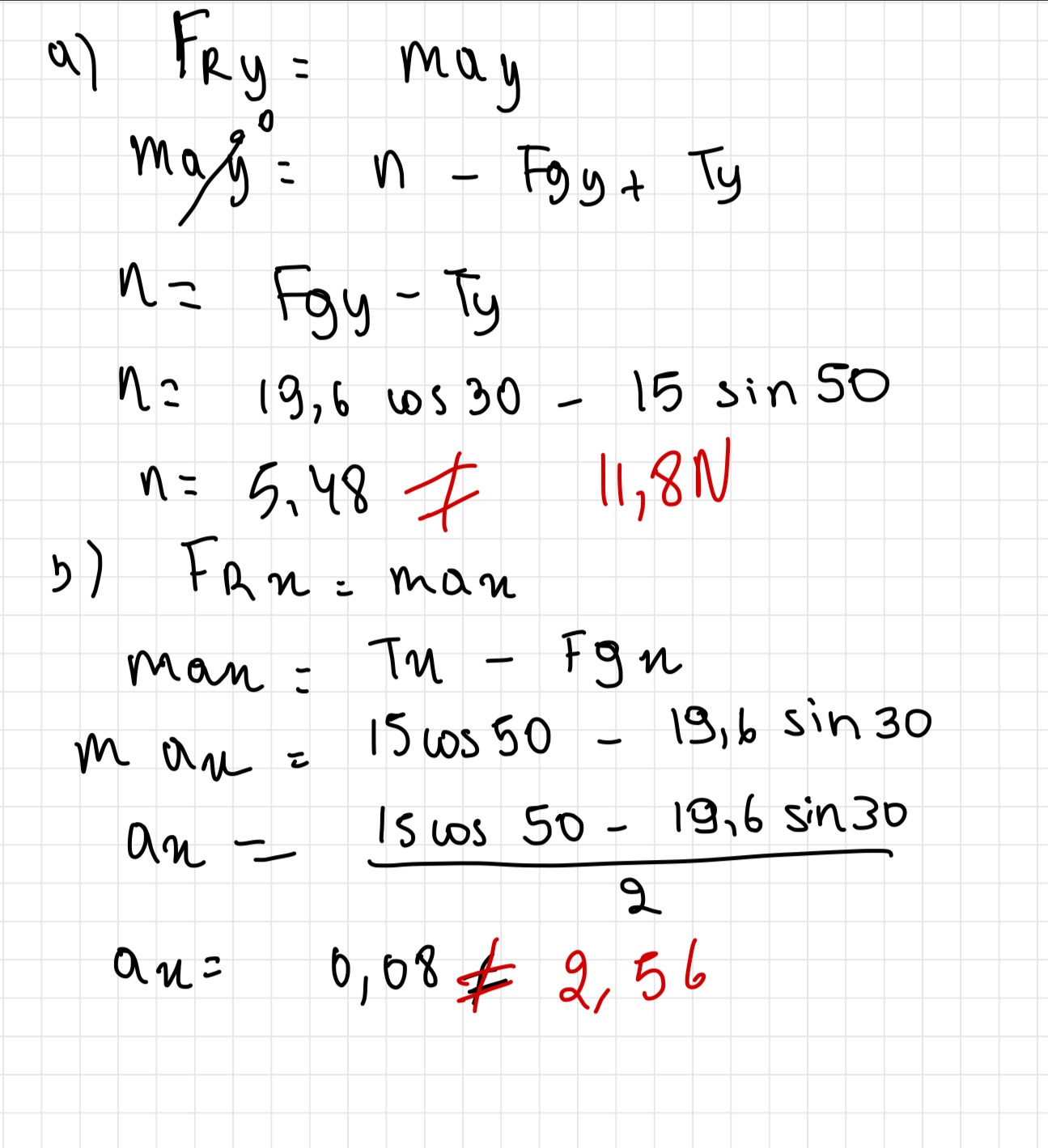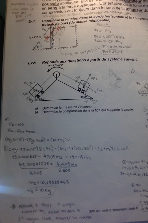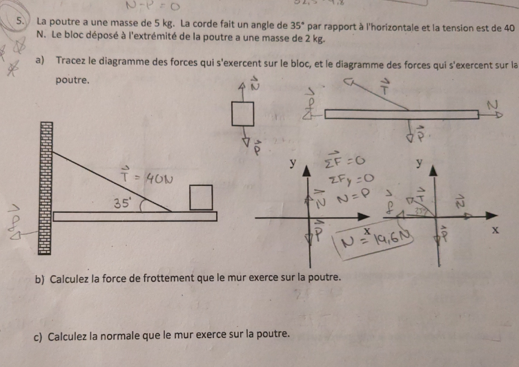 Postsecondaire • 1aBonsoir, voici ma démarche pour ce problème là. J’en n arrive pas à comprendre c’est quoi ma faute. La réponse pour le a) est supposée d être de 11.8N et pour le b) de 2.56. Aidez moi à savoir où peut être ma faute svp,votre aide m’aidera énormément, merci
