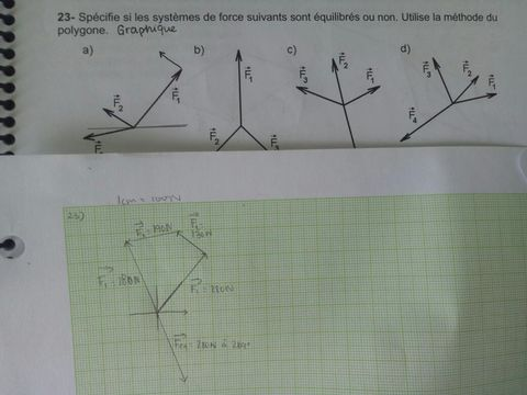J'aurais une question sur cet exercice en physique. Après les avoir mis à queue leu leu, comment savoir si ils sont équilibrés ou non?Est-ce qu'il faut dessiner la force résultante et équilibrée? Est-ce qu'il faut trouver les composantes x et y?
