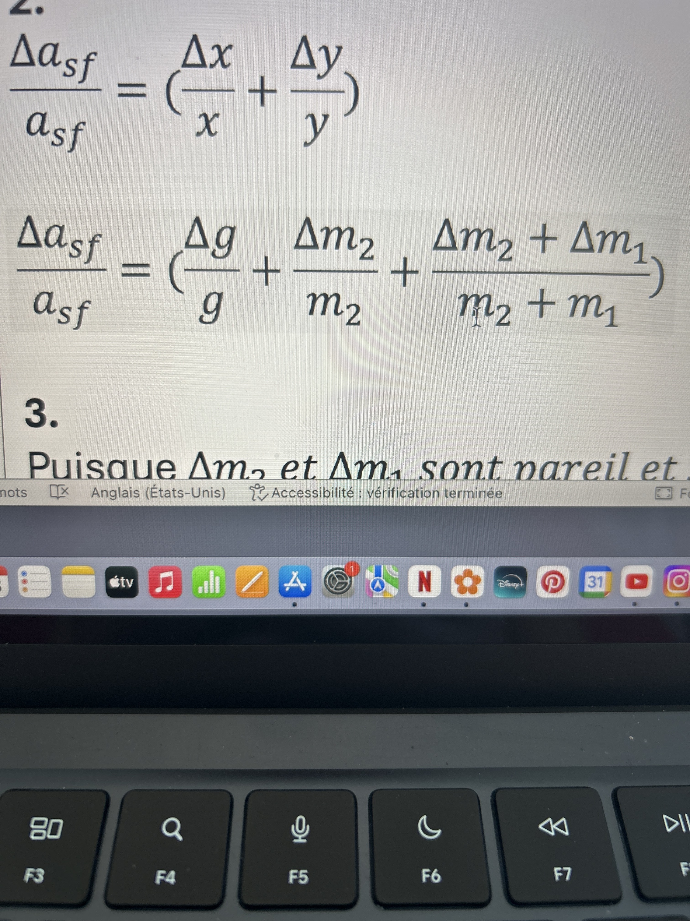 Postsecondaire • 1aBonjour, je me demandais Comment je fait pour réduire cette formule d’incertitude.Notre professeur nous a dit que l’incertitude de m2 et m1 était la même et remplacer par 🔺m alors j’ai fait çaIl a dit qui ce n’était pas encore assez réduit et qu’elle devait être plus compliqué avant de redevenir plus simple mais je ne comprends pas comment faire.