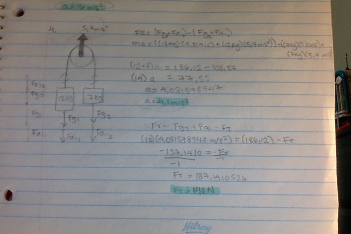 Postsecondaire • 1aBonjour. J'ai besoin d'aide. Je suis en train de revoir mes notes de cours pour un test en physique et je ne comprend pas pourquoi dans ce problème j'ai fait Fr=Fa1-Fa2 au lieu de faire Fr=Fa2-Fa1. Naisse pas que Fa1 vas de la même direction que Fr donc que Fr+Fa1=Fa2? Si j'ai tord alors pourquoi dans le problème de poulie l'équation qui m'a donné la bonne réponse est Fr=Fg+Fai-Ft? (avec la même logique Ft vas du même bord que Fr)