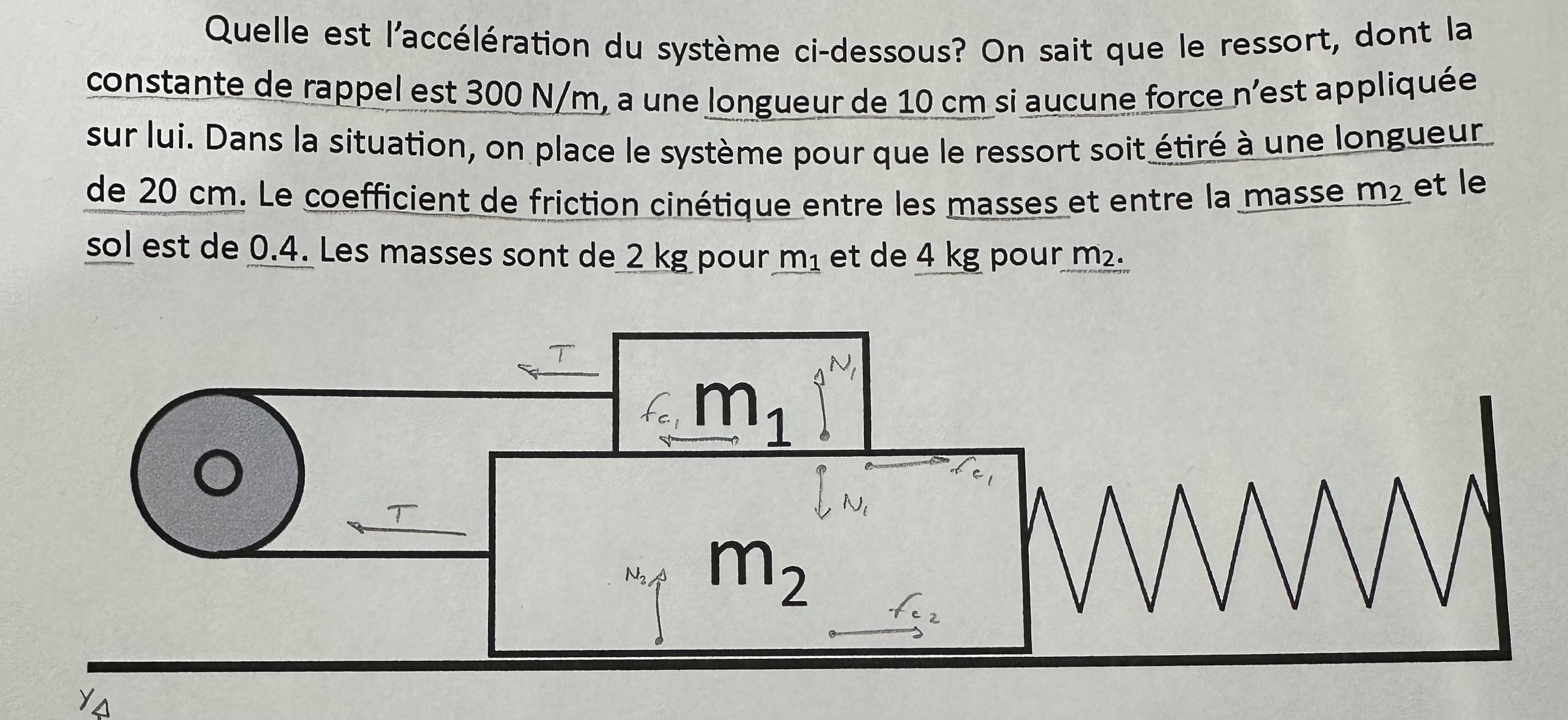 Postsecondaire • 1aJe dois calculer l’accélération de ce système dynamique, mais je ne suis pas sûre par où se déplacent les deux masses. Si le ressort est étiré, ça veut dire que la masse 2 se déplace vers la gauche, mais pourtant comme elle est reliée à une corde par la poulie, la masse 1 ne peut pas tirer sur elle puisqu’elle pèse moins que la masse 2. Pouvez-vous m’aider à trouver par quelle direction se déplacent les deux masses?