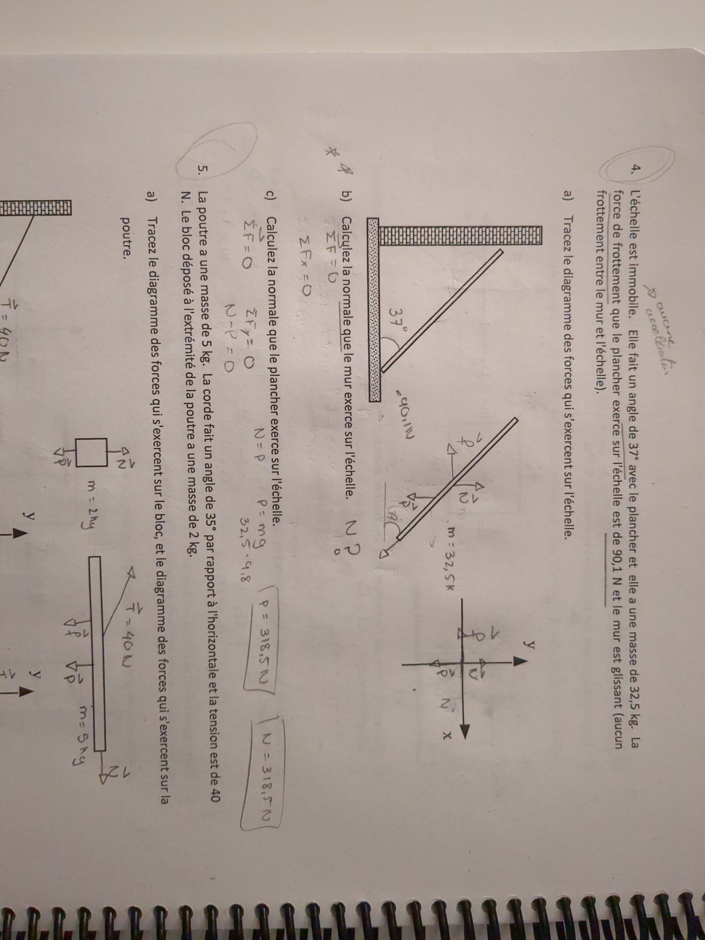 Je ne comprends pas comment résoudre la première question et la deuxième je n'arrive pas à tracer la normale que le mur exercice sur l'échelle