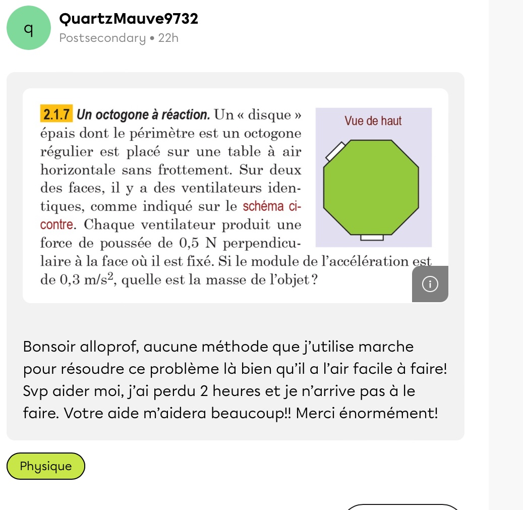 Postsecondaire • 1abonjour je ne comprends pas comment résoudre ce problème. J’ai commencer par le diagramme de force et je suis bloquer je n’arrive plus à le faire . Pouvez-vous m’aidez s’il vous plaît ?