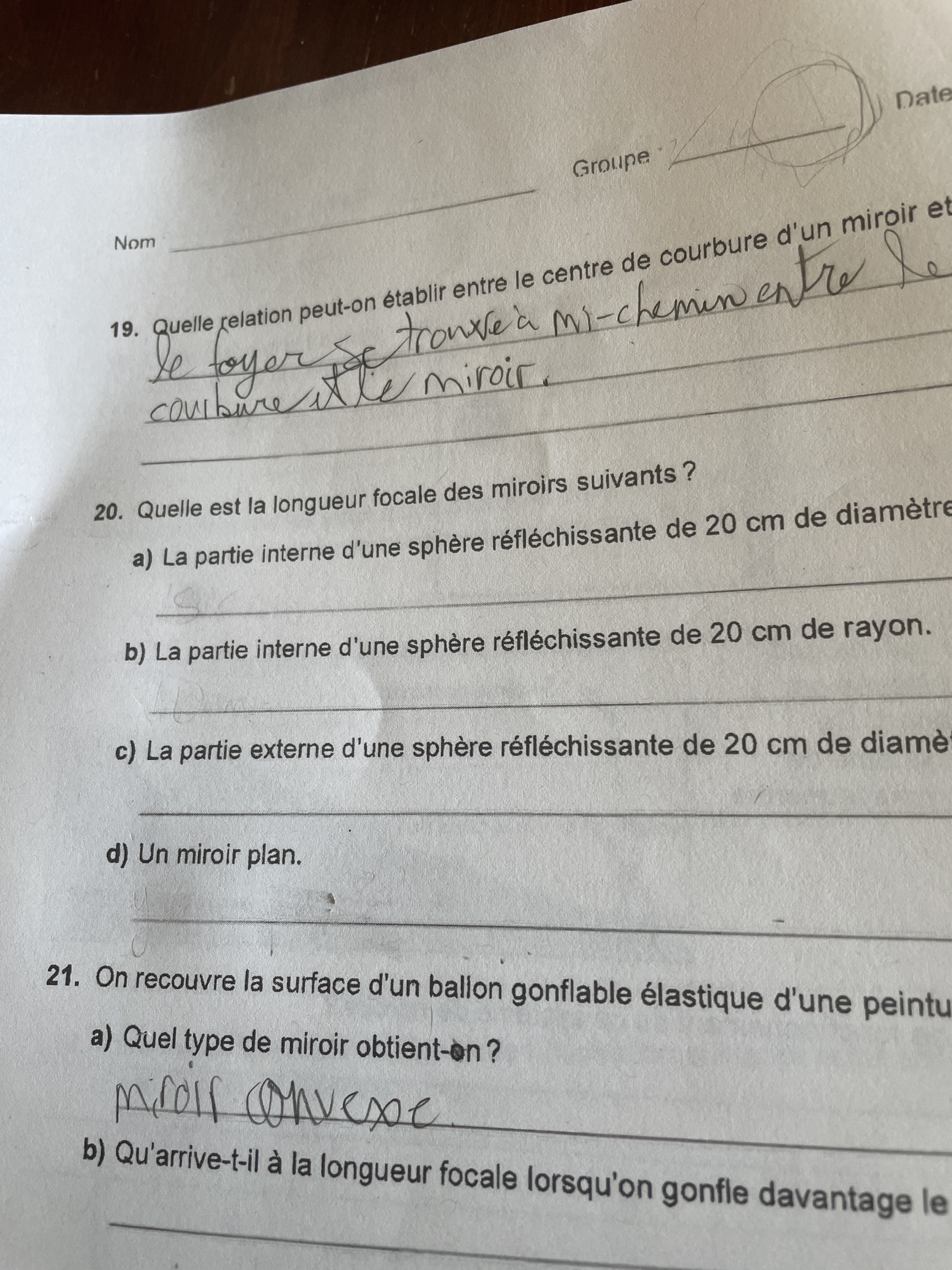 Secondaire 5 • 1aJe viens de faire un labo en physique pour prouver que pour un miroir courbe loli=f². On a utilisé un miroir concave, une grande règle, une source lumieuse LED et un ecran (un peu epais) pour trouver l'image. Pour le rapport de lab il faut trouver 3 sources d'erreurs et j'en ai trouvé qu'un (l'épaisseur de l'écran). Quelqu'un pourrais m'aider??