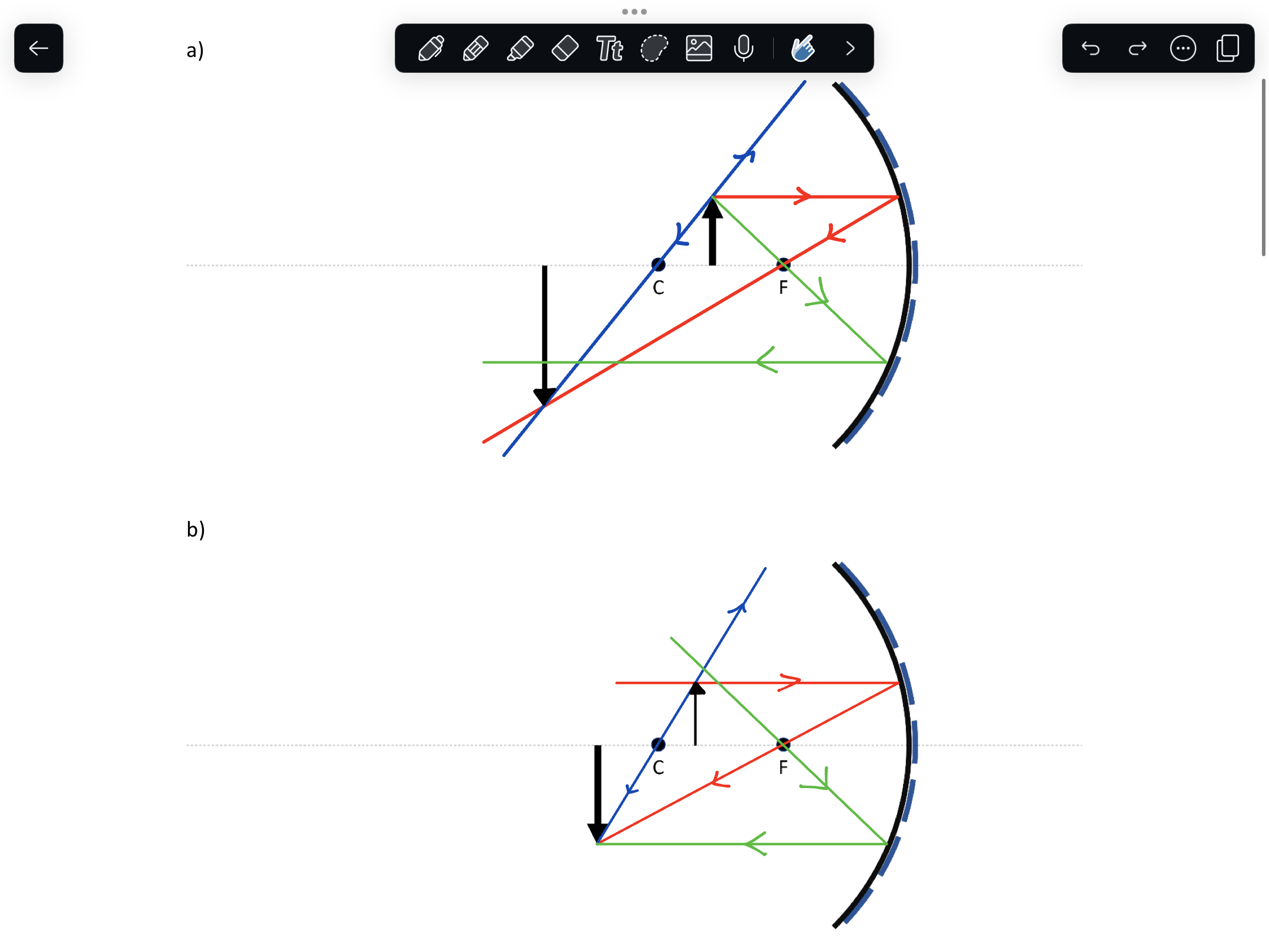 Secondaire 5 • 1aBonjour! Dans le cas des miroir concaves, je n’arrive jamais à bien tracer le rayon vert. Toujours les rayons rouge et bleu se croisent, mais le vert ne va jamais se croiser avec eux. Est-ce que j’ai fais une erreur?