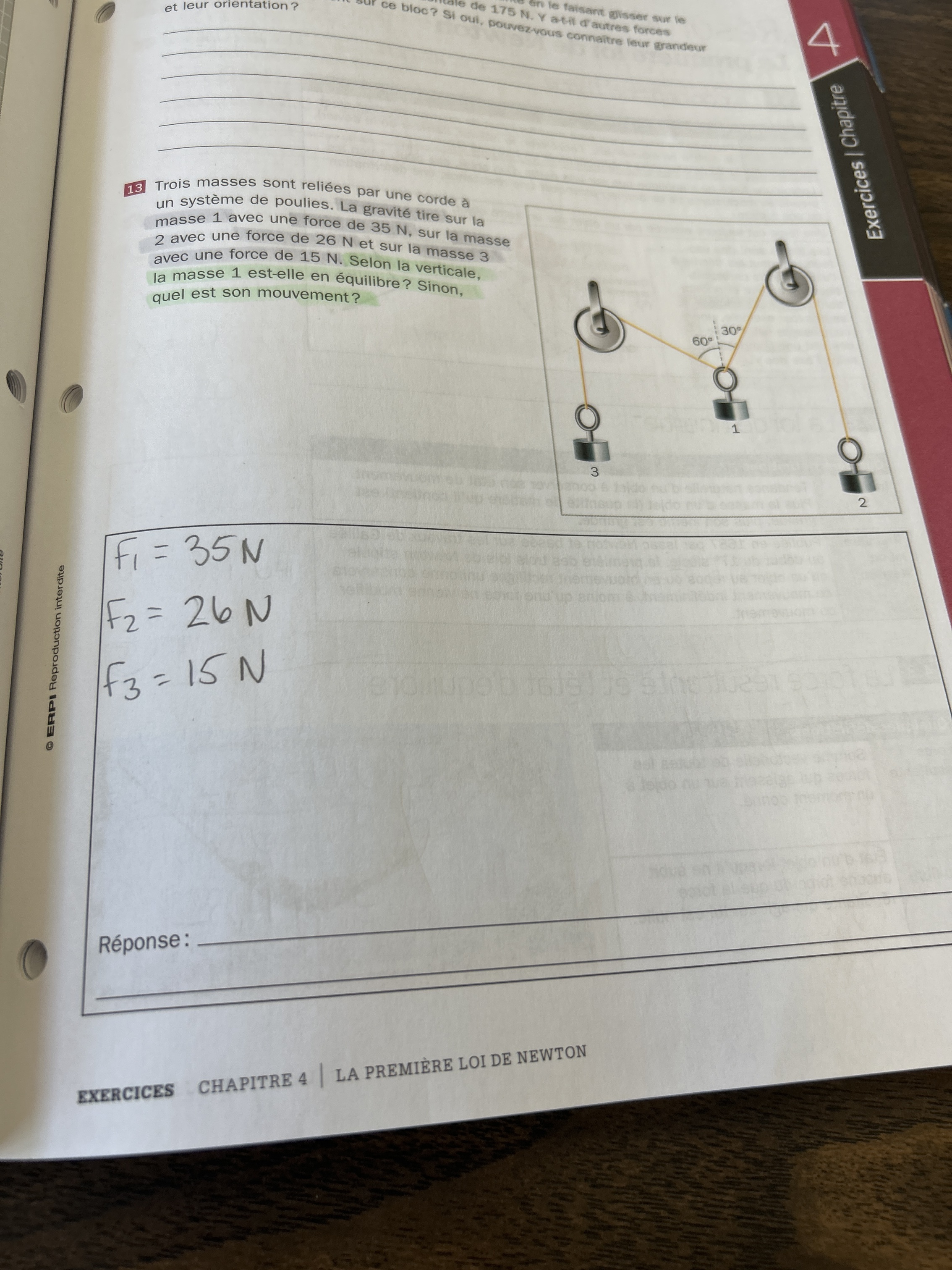 Secondaire 5 • 1aUtilise l'illustration suivante pour déterminer l'accélération du système, la tension dans la corde de gauche et de droite en considérant une force de frottement de 3,8 N sur le bloc de 4,2 kg