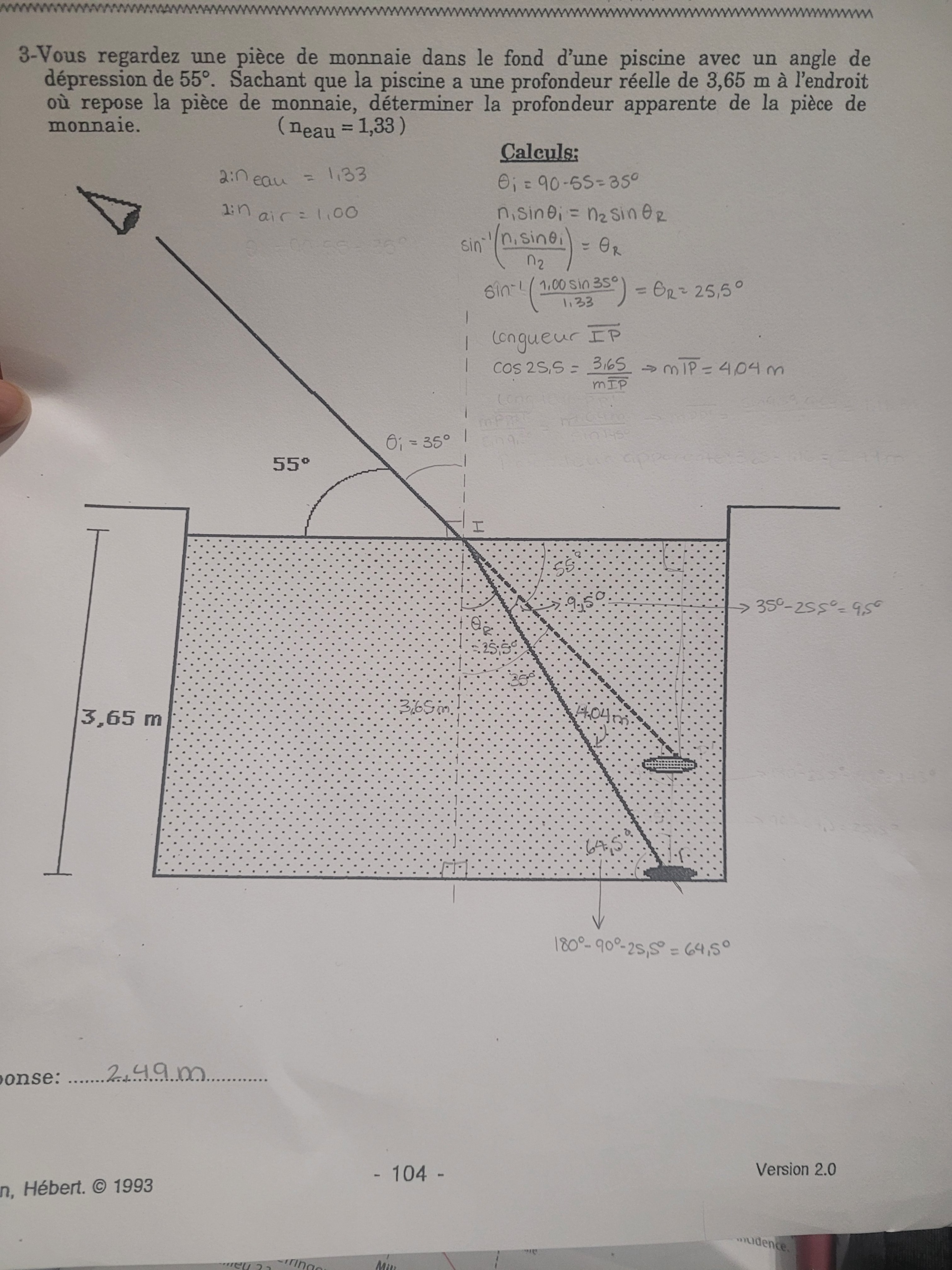 Ai-je raison de croire que c'est 15,4° car, logiquement, étant donné que le rayon provient de l'air et qu'il est mentionné qu'il ressort, il est sensé avoir le même angle. Mais ce principe est lorsque le rayon traverse un seul milieu et en ressort ensuite. Par contre, je ne trouve pas d'explication à propos de problèmes dans lesquels le rayon traverse plusieurs milieux avant de ressortir, comme dans celui-ci.