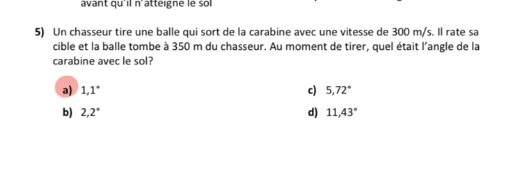 Secondaire 5 • 1aSalut! Voici un numéro sur la projectiles des objets lancés obliquement ainsi que son corriger. Le contexte de la question dit que chasseur tire une balle qui rate sa cible et tombe au sol. Dans le corriger le delta y est de 0m??. Dans ma tête le pistolet et déjà à une hauteur inconnu vu qu’il est tenu par le chasseur et s’il tombe au sol, il devrait avoir un déplacent en y.