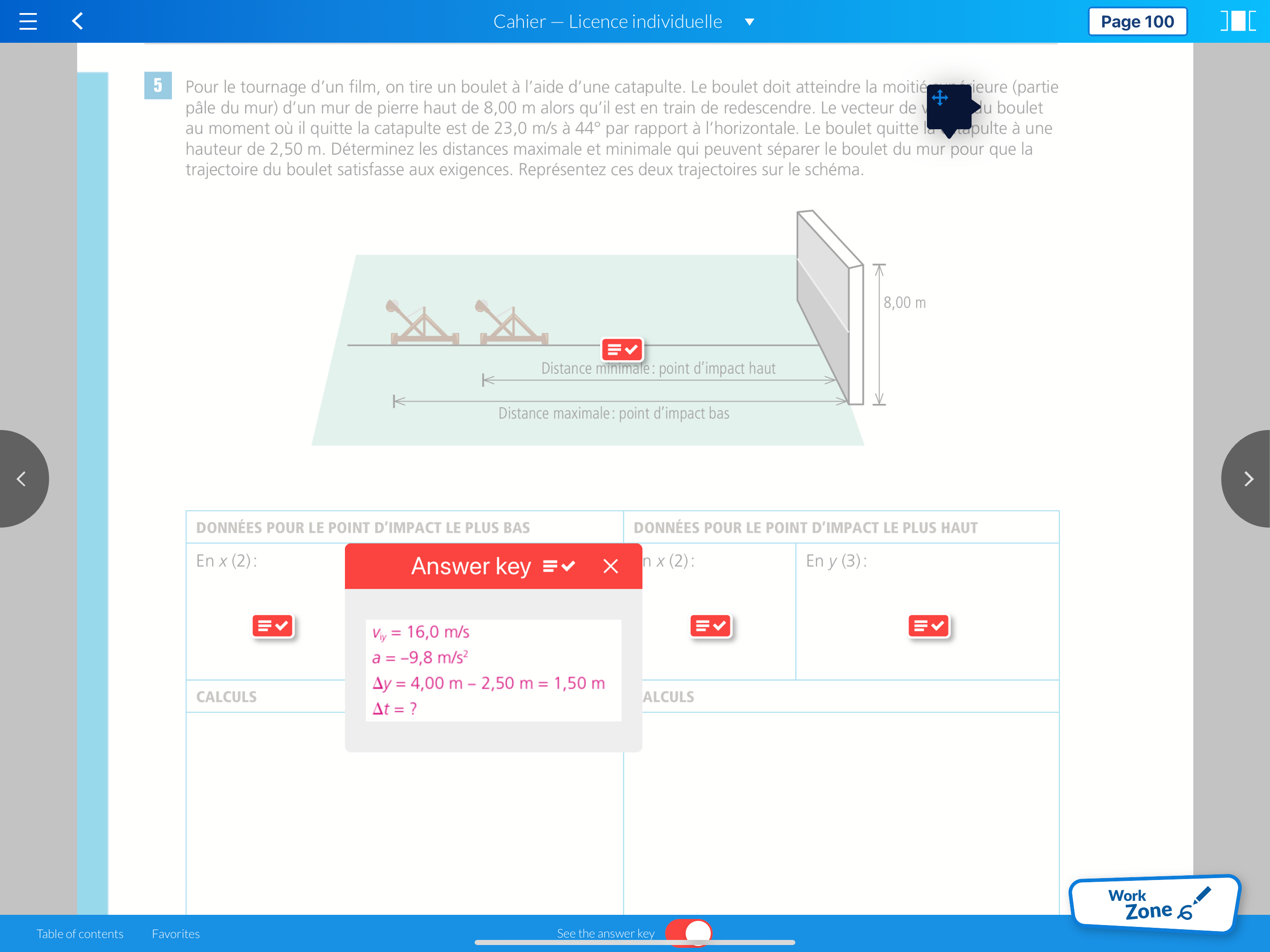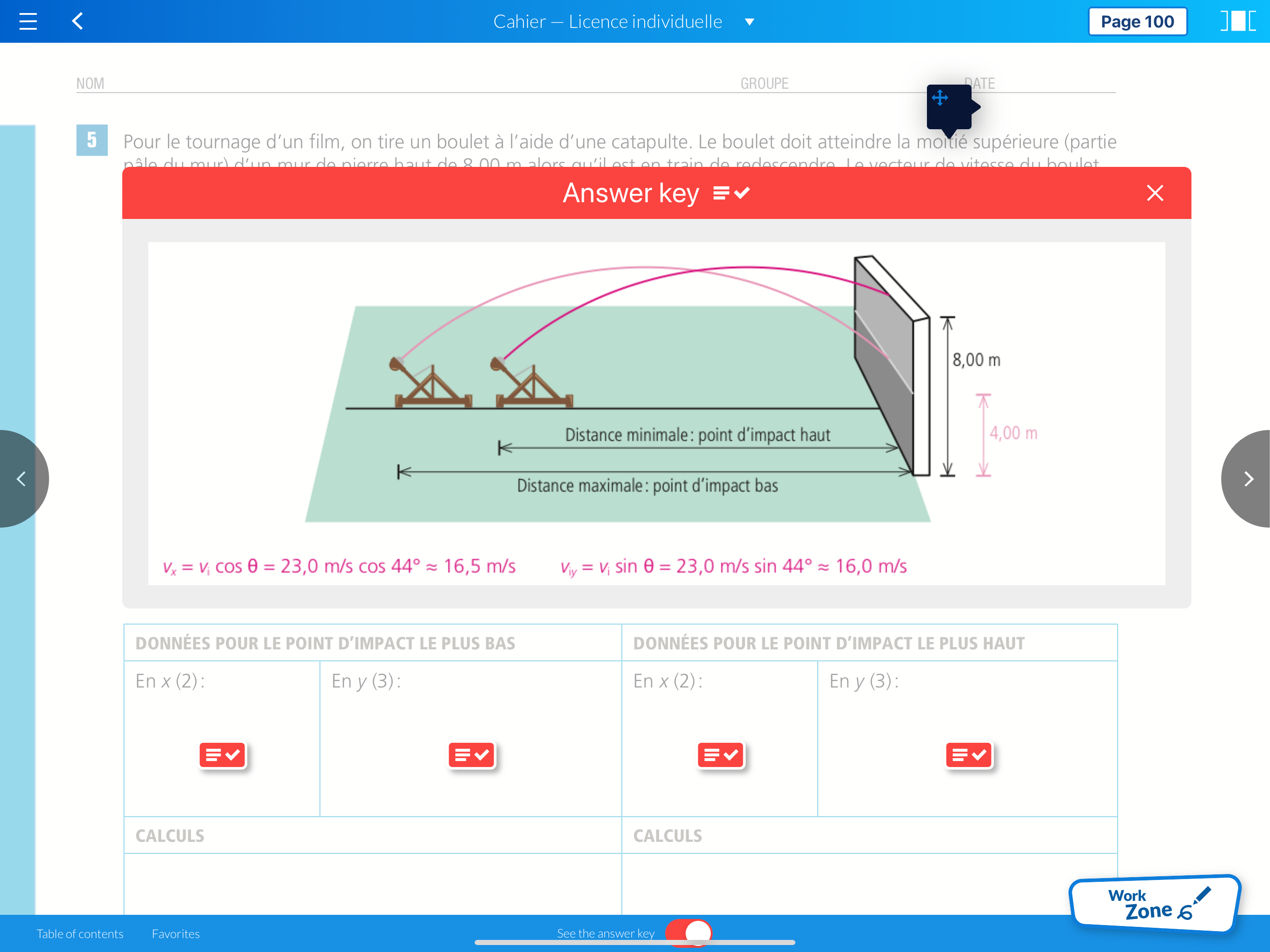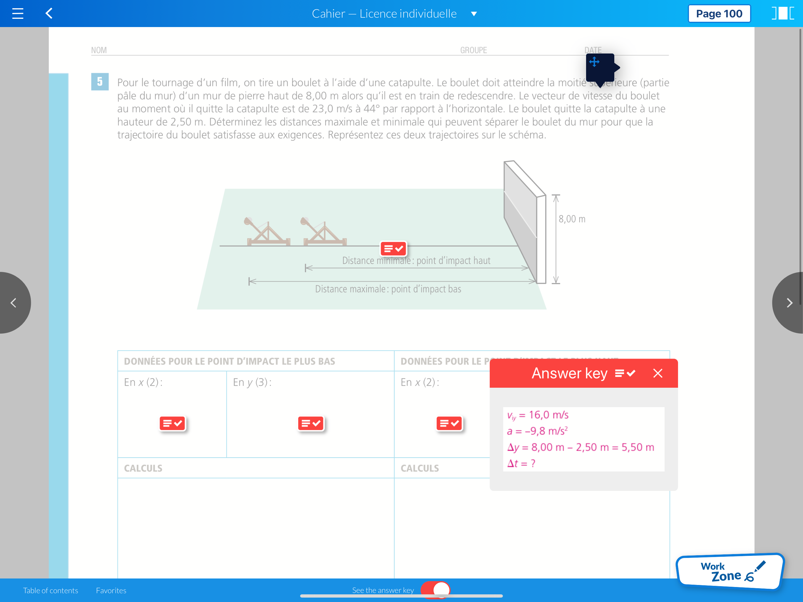 Note: Négligez la résistance de l'air et considérez toujours que la position de départ du projectile est la position (0 m, 0 m).
