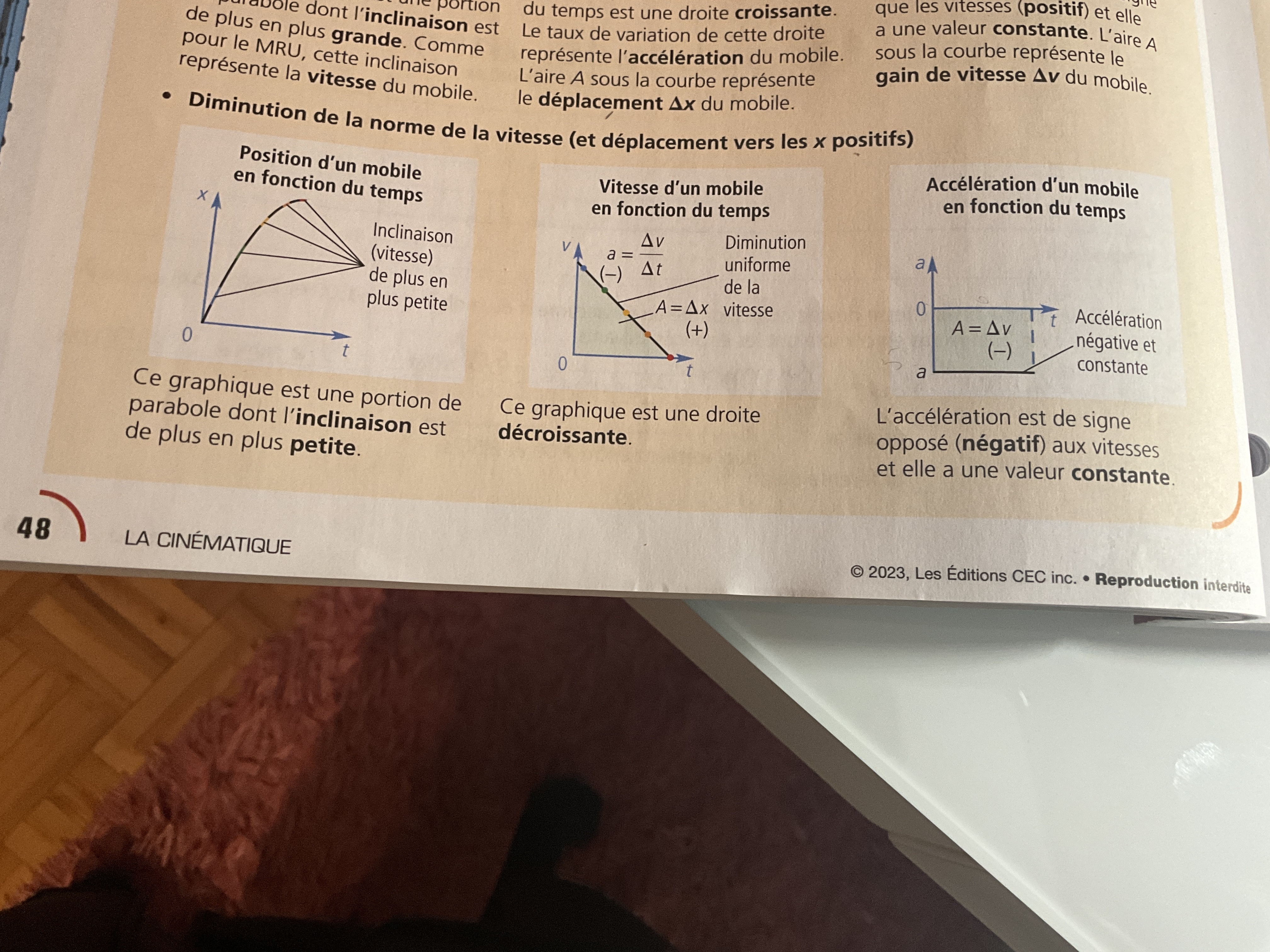 Secondaire 5 • 1aComment dans le graphique de l’accélération d’un mobile en fonction du temps, l’aire sous la courbe nous conclut qu’on a une vitesse NÉGATIVE, alors qu’on peut voir que dans le graphique de la position en fonction du temps de la même situation, le calcule de la tangente à la courbe d’un point qui nous donne aussi la vitesse est positif??