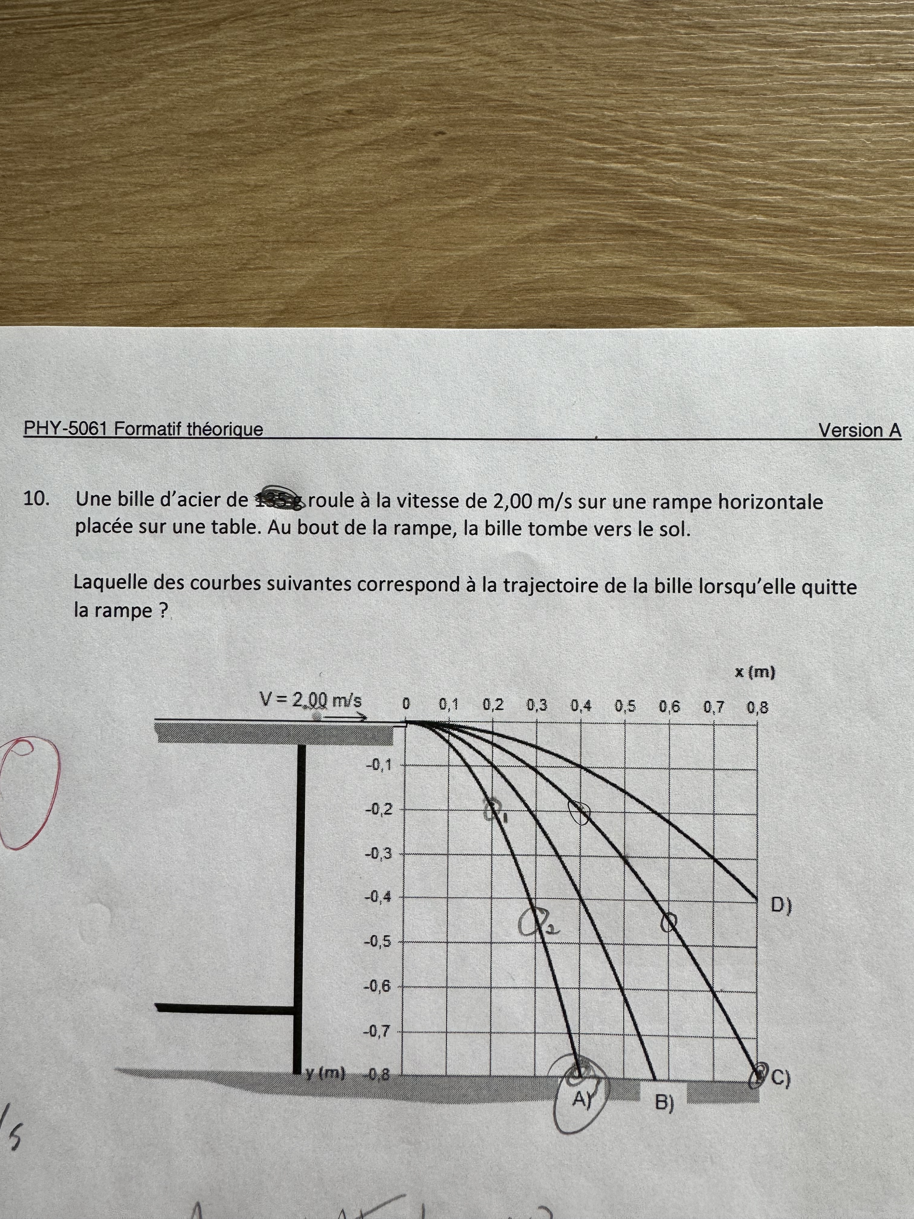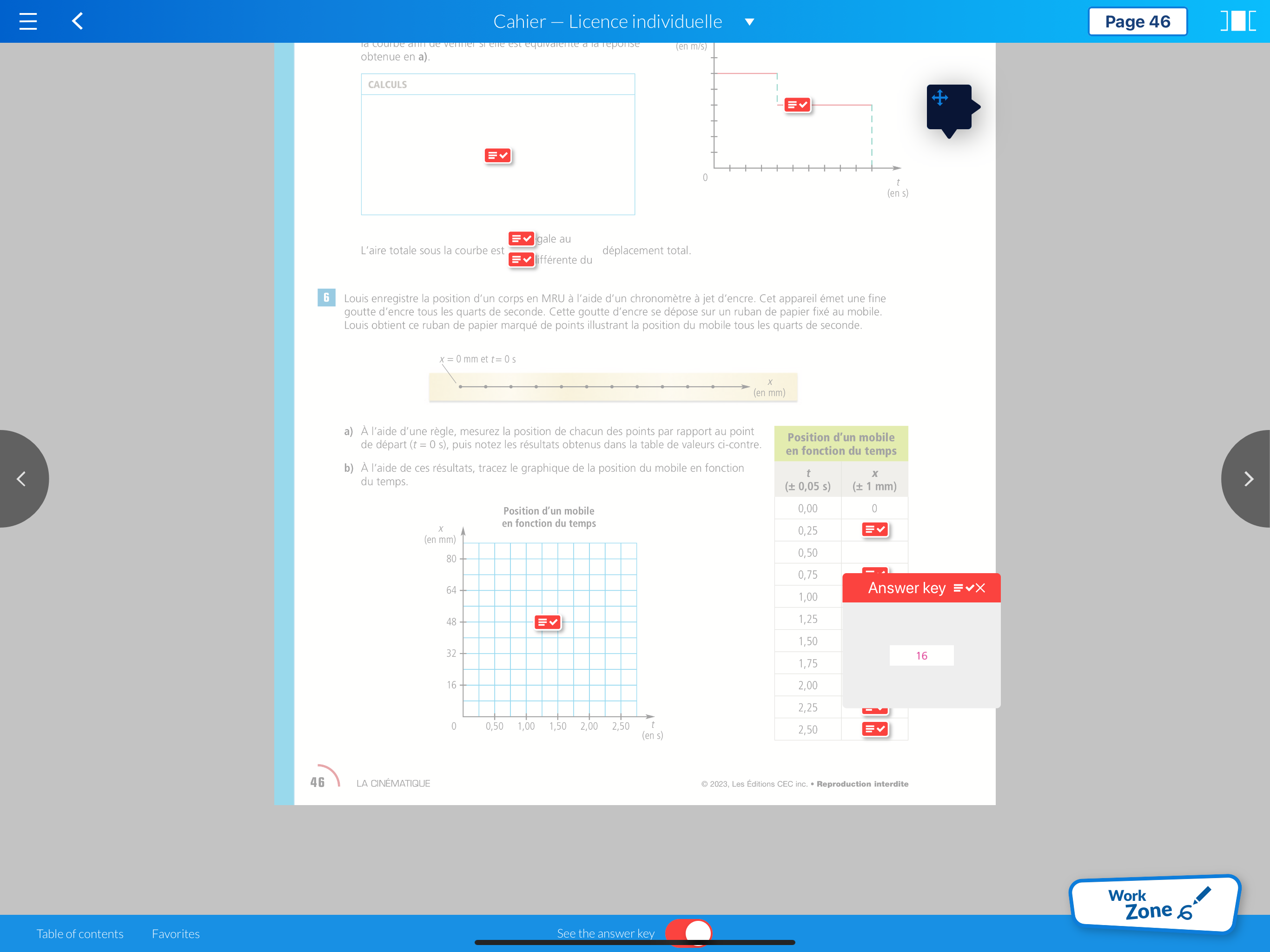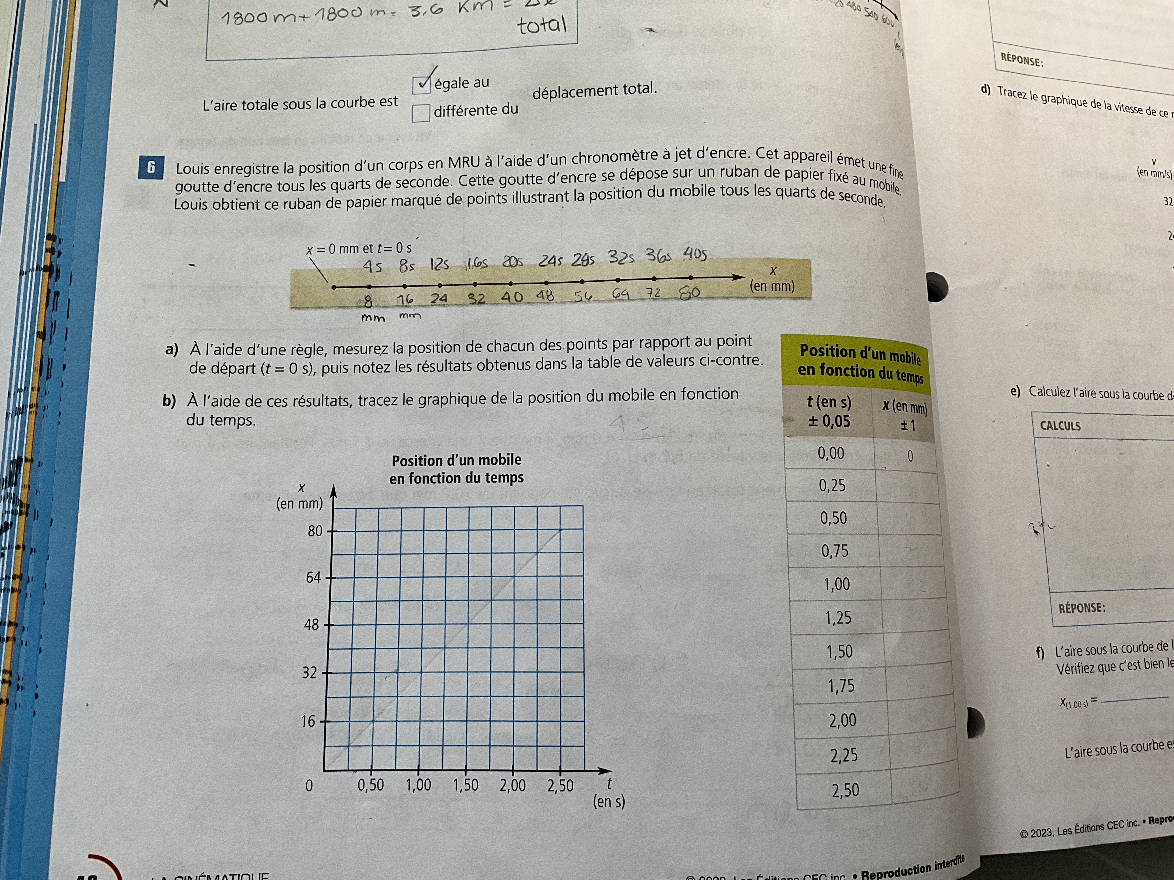 Secondaire 5 • 1aVoici le corrigée d’un problème dans mon cahier d’exercice Trajectoire en physique sec5 dans le sujet de la cinématique. Le problème dit qu’un appareil émet une fine goutte d’encre à tous les 4 secondes et la questions ne demande ensuite de mesurer la distance en mm avec une règle entre chaque gouttes ou la premières gouttes représentés 0s et 0mm. Quand j’ai mesuré j’ai trouver qu’à chaque 4secondes le mobile de déplacé de 8mm. Cependant dans le corriger, la table de valeurs du corriger contredit cela en disant qu’à 0,25 secondes, le mobile est à 8mm et à 0,50s, le mobile et à 16 mm ainsi de suite. Je ne comprend pas comment ils peuvent affirmer cela alors que il est claire que c’est à 4 secondes que le mobile et à 8mm???