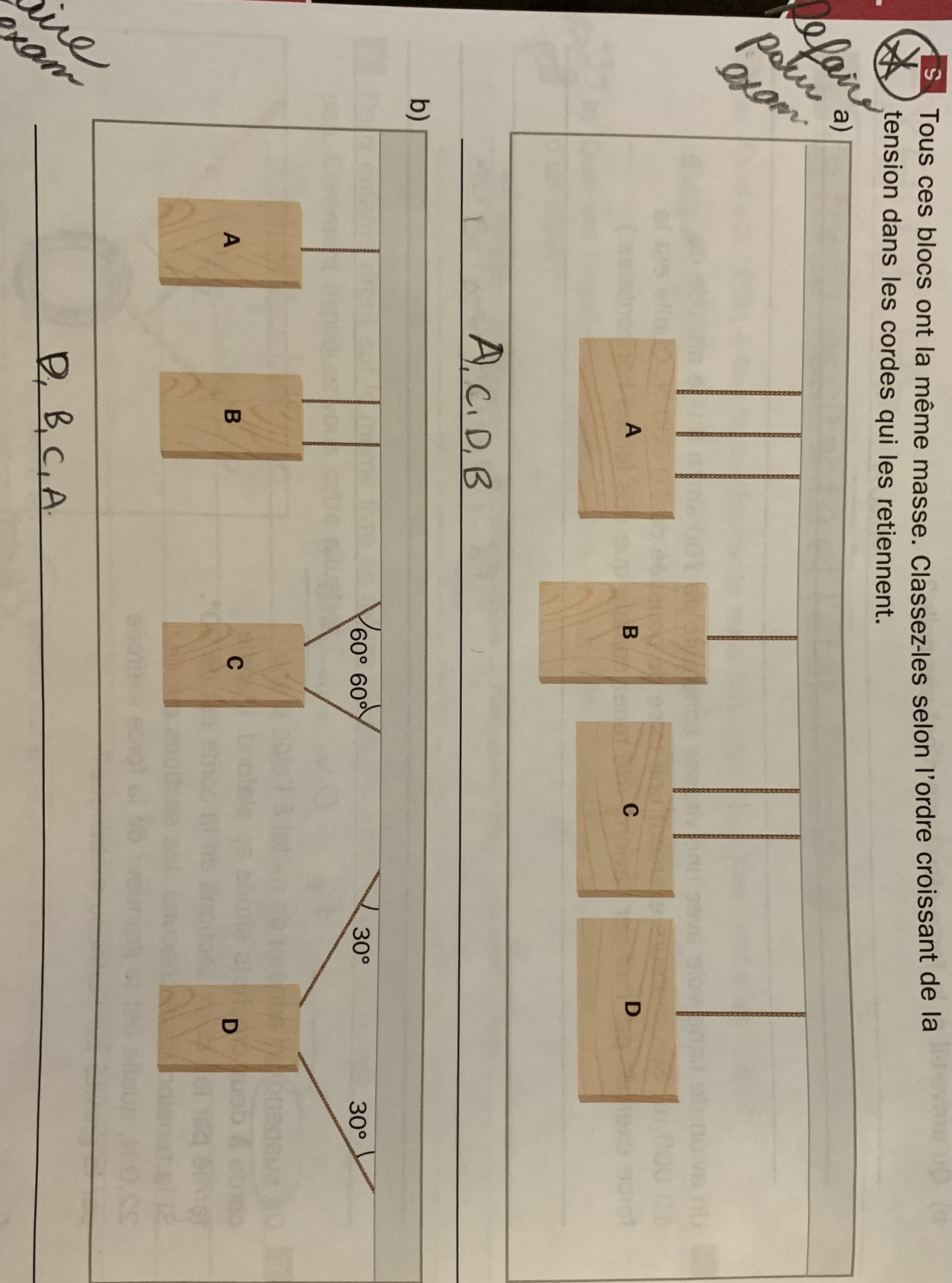 J'ai attaché une photo d'un exercice dans le cahier, mais qu'on n'a pas traité en classe et je suis très confus. C'est une question du cahier OPTIONscience, sur le chapitre 4 du volet Méchanique. Deux situations sont représentées avec quatre blocs de bois chacun avec des masses équivalentes. On demande de classer les blocs en order de la tension dans les cordes qui les retiennent.Le corrigé du cahier dit la réponse pour le a) est A, C, B et D (B et D à égalité). Pour le b), B, C, D et A (D et A à égalité).