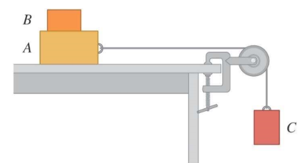 Postsecondaire • 1aUn bloc B (masse = 5 kg) est posé sur un bloc A (masse = 8 kg). Le bloc A est tiré par une corde attachée à une poulie reliée à un bloc C qui pend verticalement.Si le coefficient de frottement statique entre les blocs A et B est égal à 0.75, et s'il n'y a aucun frottement entre le bloc A et la table, quelle est la masse maximale que C peut avoir pour que le bloc B reste posé sur le bloc A lorsque le bloc C est lâché?
