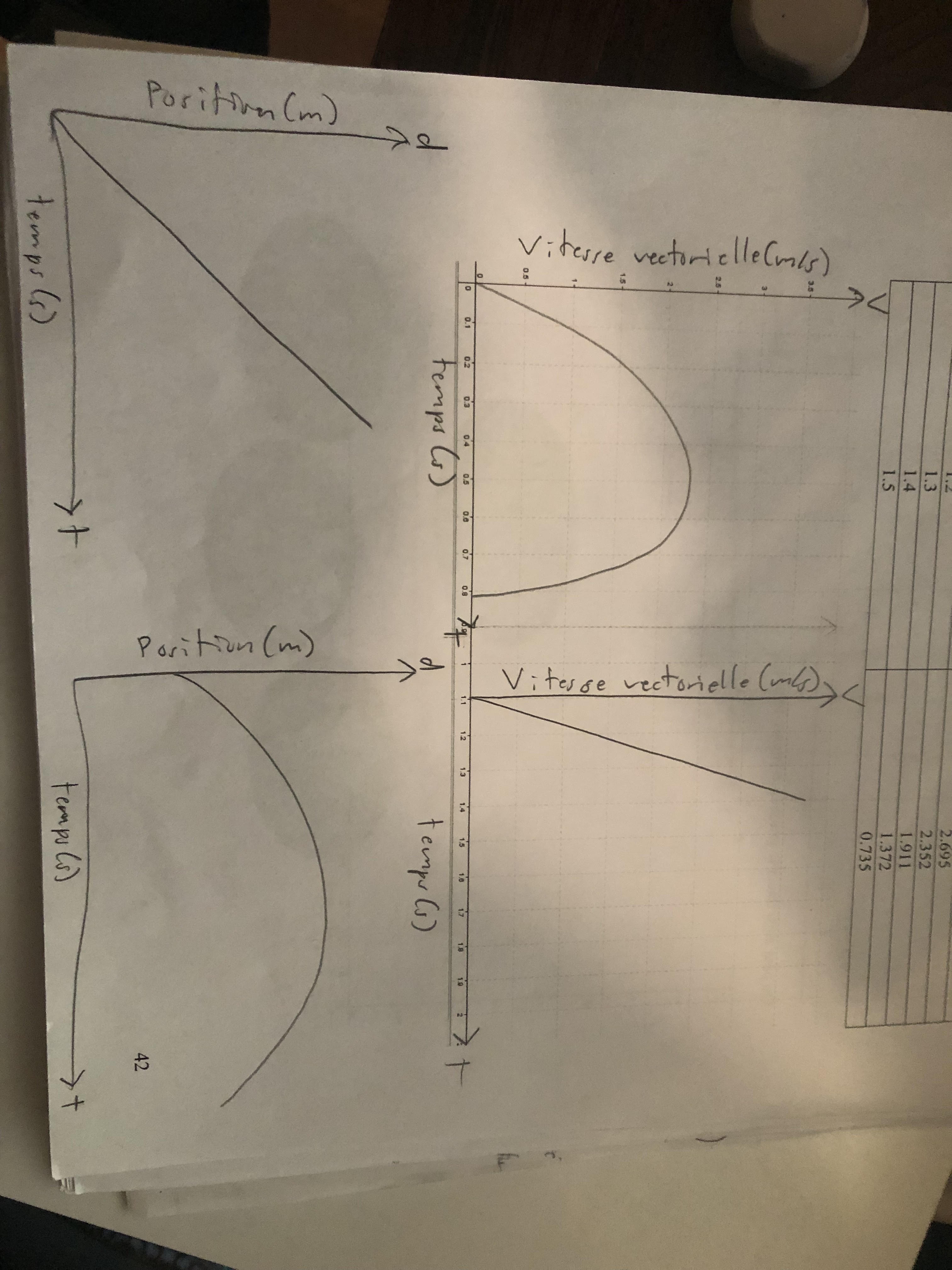 Secondaire 5 • 1aQuand on a un ligne droite sur un graphique position-temps sa veut dire quoi? Aussi si on a un parabole sur un graphique position-temps, un ligne droite sur un graphique vitesse vectorielle-temps et un parabole vitesse vectorielle-temps? Comme sa veut dire quoi pour chacun? Ça c'est un exemple pour chacun: