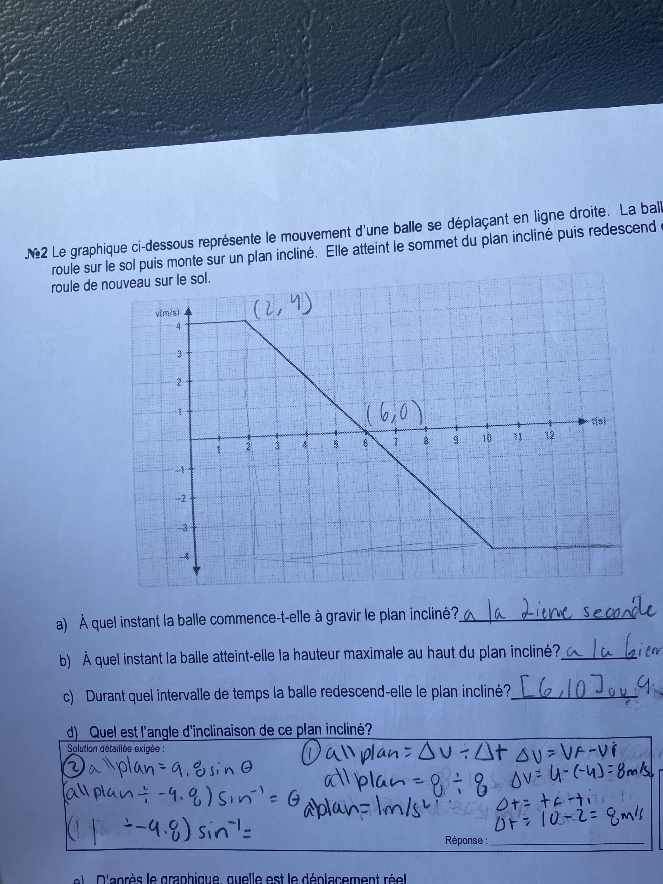 Secondaire 5 • 1abonjour esque mon calcul pour l’angle d’inclinaison est correct? je croit que j’ai une erreur mais je sais pas ou (question D)