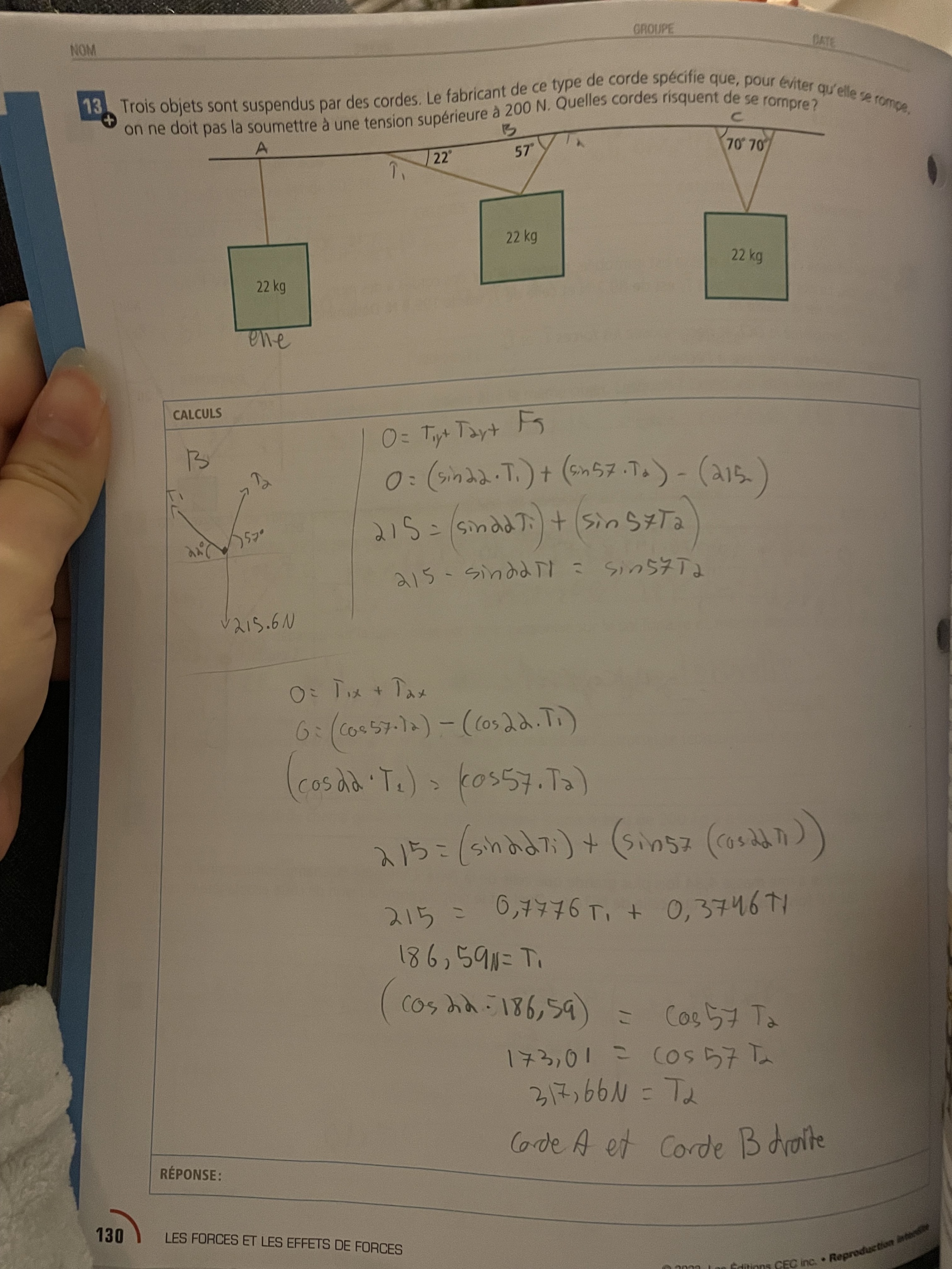 Secondaire 5 • 1aBonjour! Est ce que quelqu'un peut confirmer si ma réponse est bonne car je sais que les cordes que j'ai mit c'est les correctes mais je ne sais pas si les valeurs de tension sont bonnes car ce n'est pas dans le corrigé. merci!
