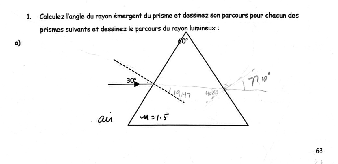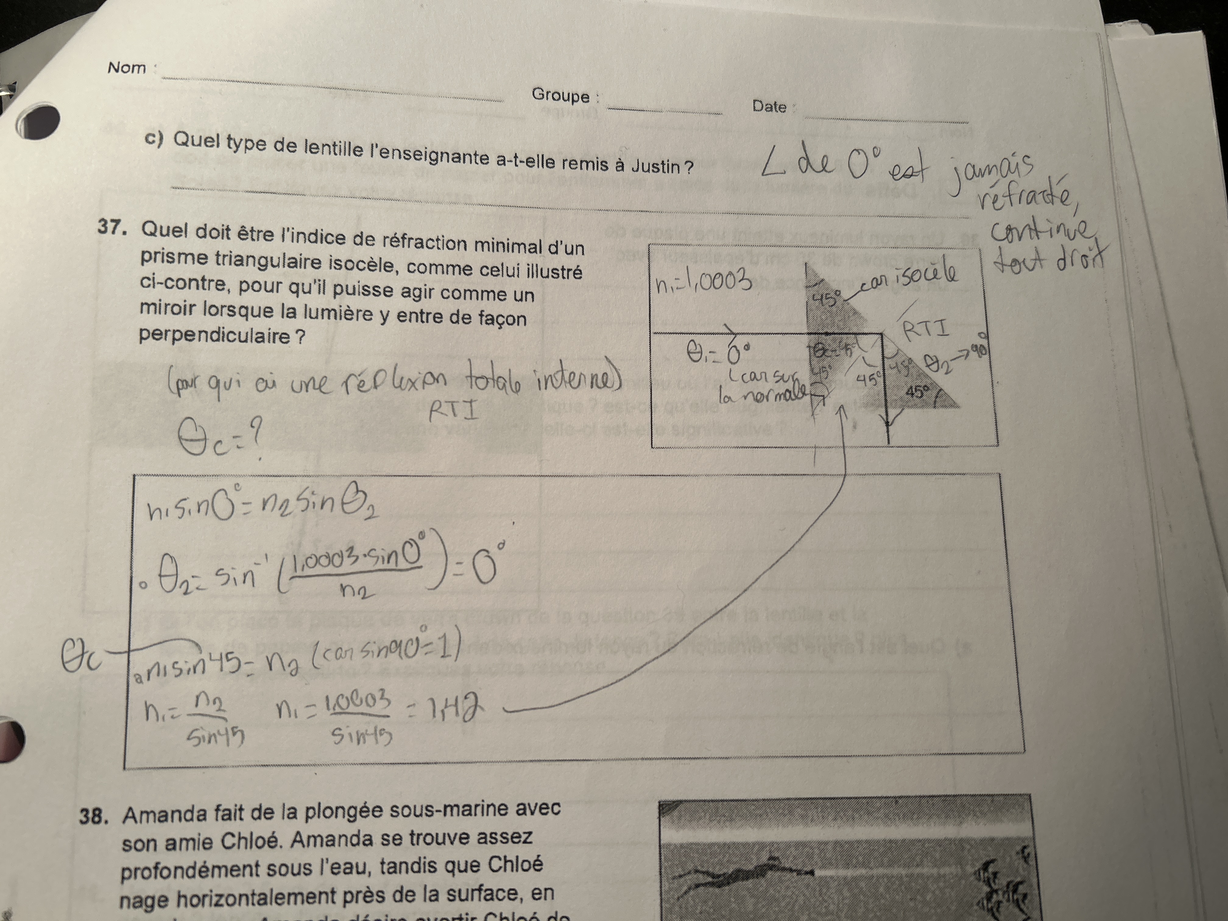 Secondaire 5 • 1aBonjour, j’ai un exercice sur la réflexion totale interne mais je n’y comprends vraiment rien! J’espérais que peut-être vous pourriez m’expliquer le raisonnement derrière les étapes faites par la prof. Merci beaucoup!!