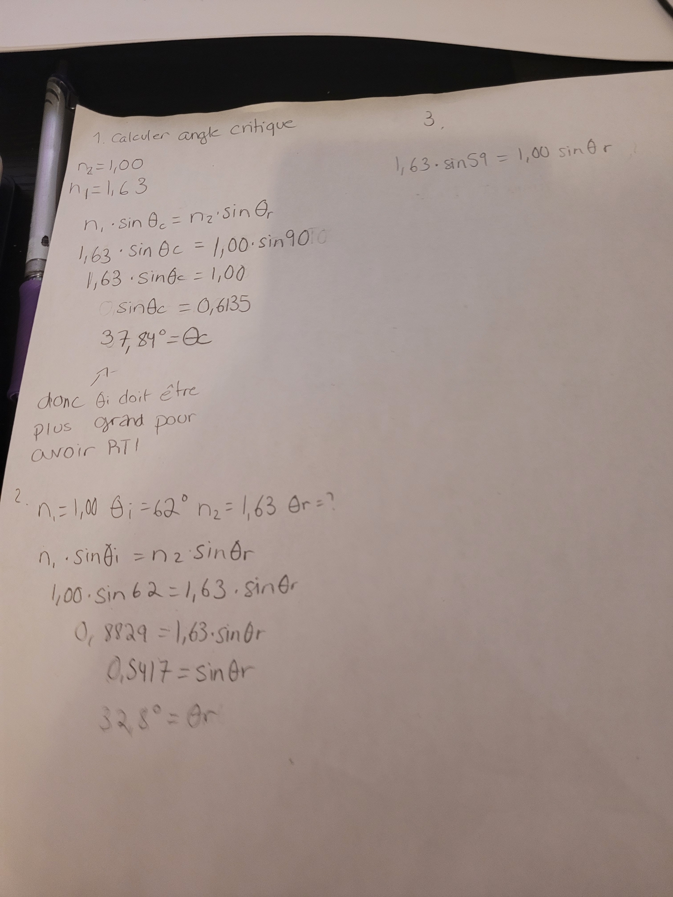 Secondaire 5 • 1aSi on envoie un rayon à la surface de l'eau(sachant que le premier milieu est de l'air) , est-ce que celui-ci formera un angle critique, fera une réfraction ou fera une réflexion total interne ?