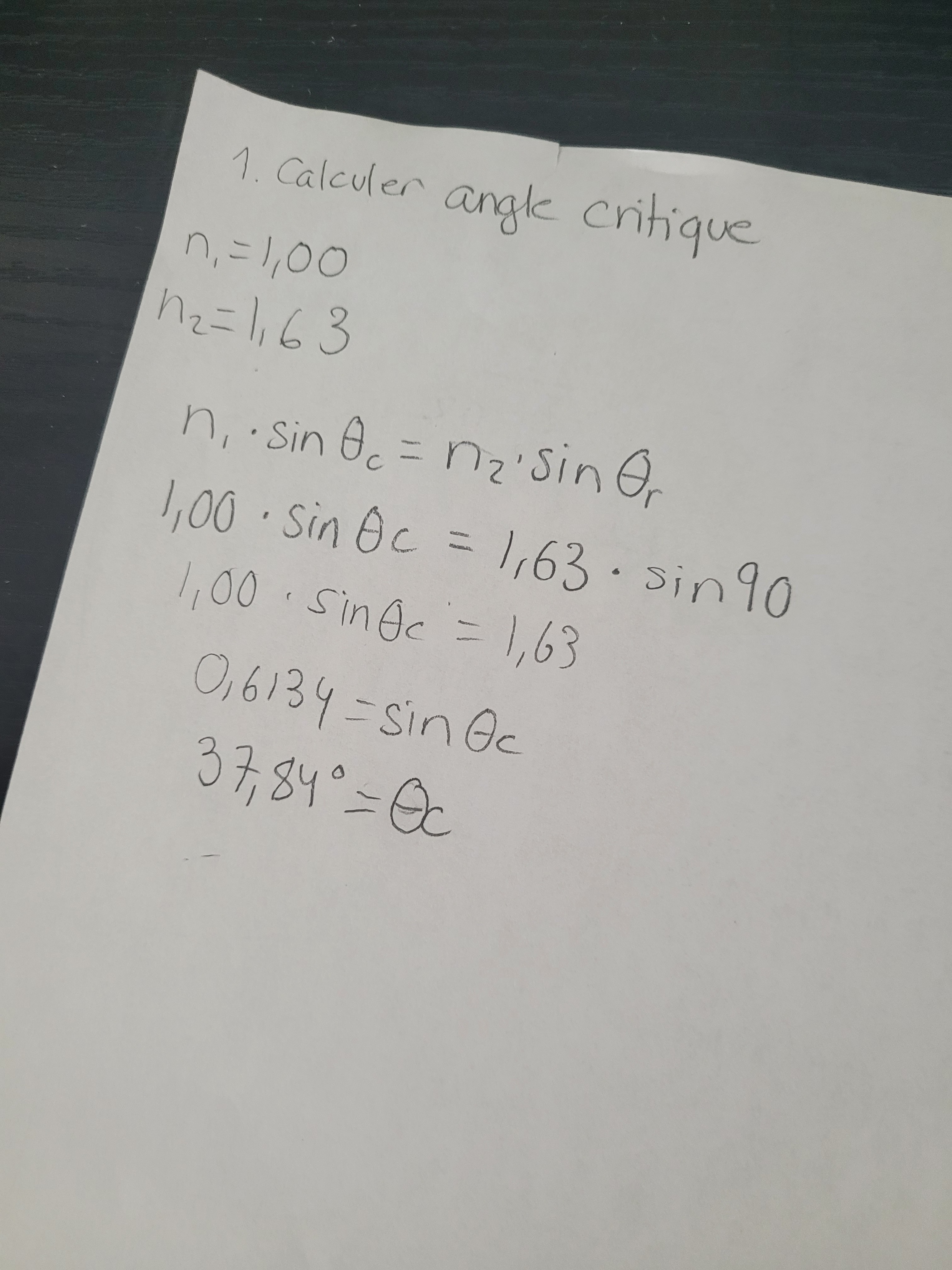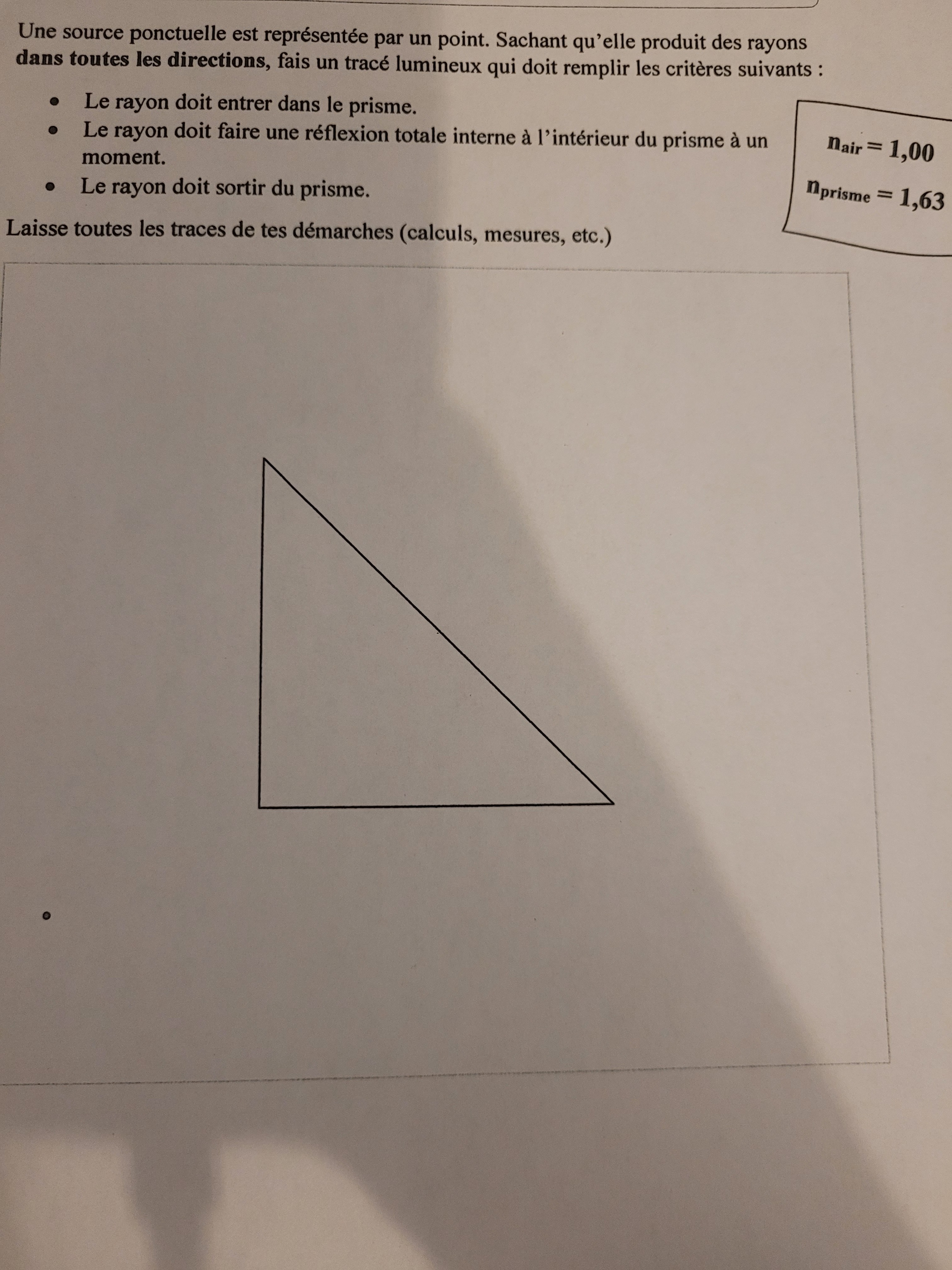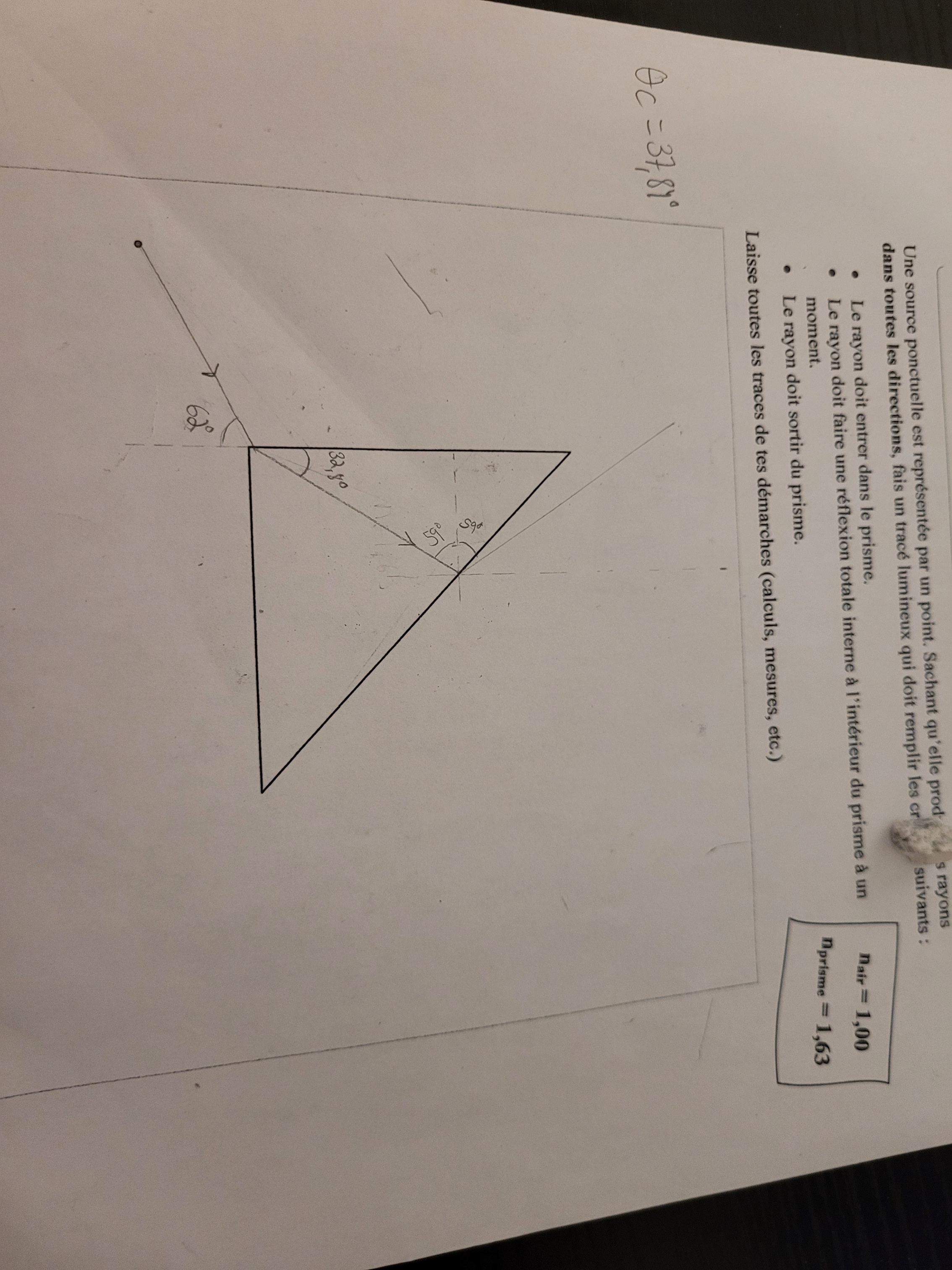 Secondaire 5 • 1aBonjour, j'ai trouve l angle critique Qui est de 37,84 degree et apres ça je ne sais pas quoi. Est ce que je trace le rayons prevent du point (source) sur l image?