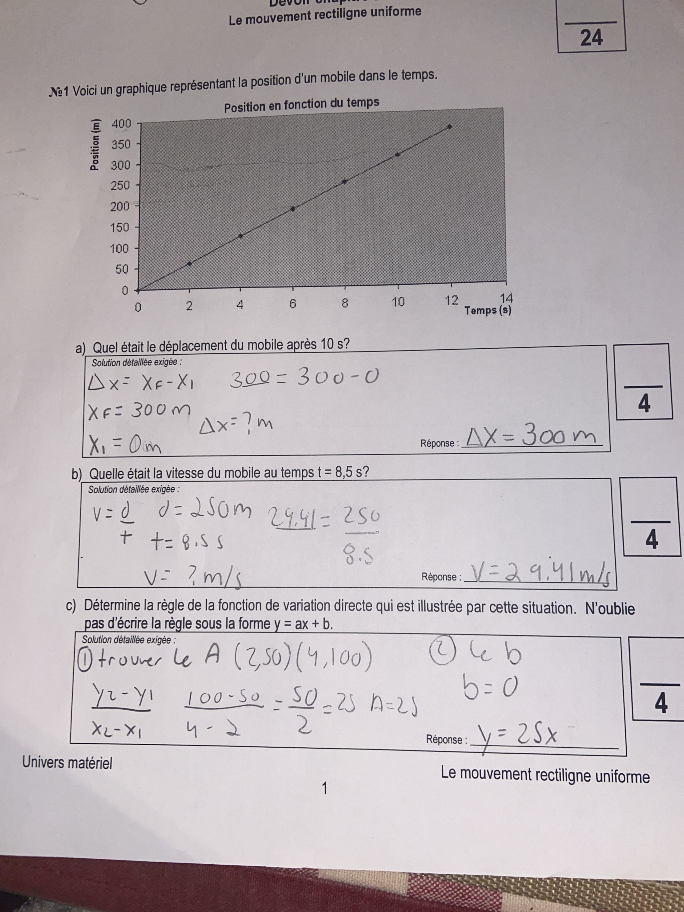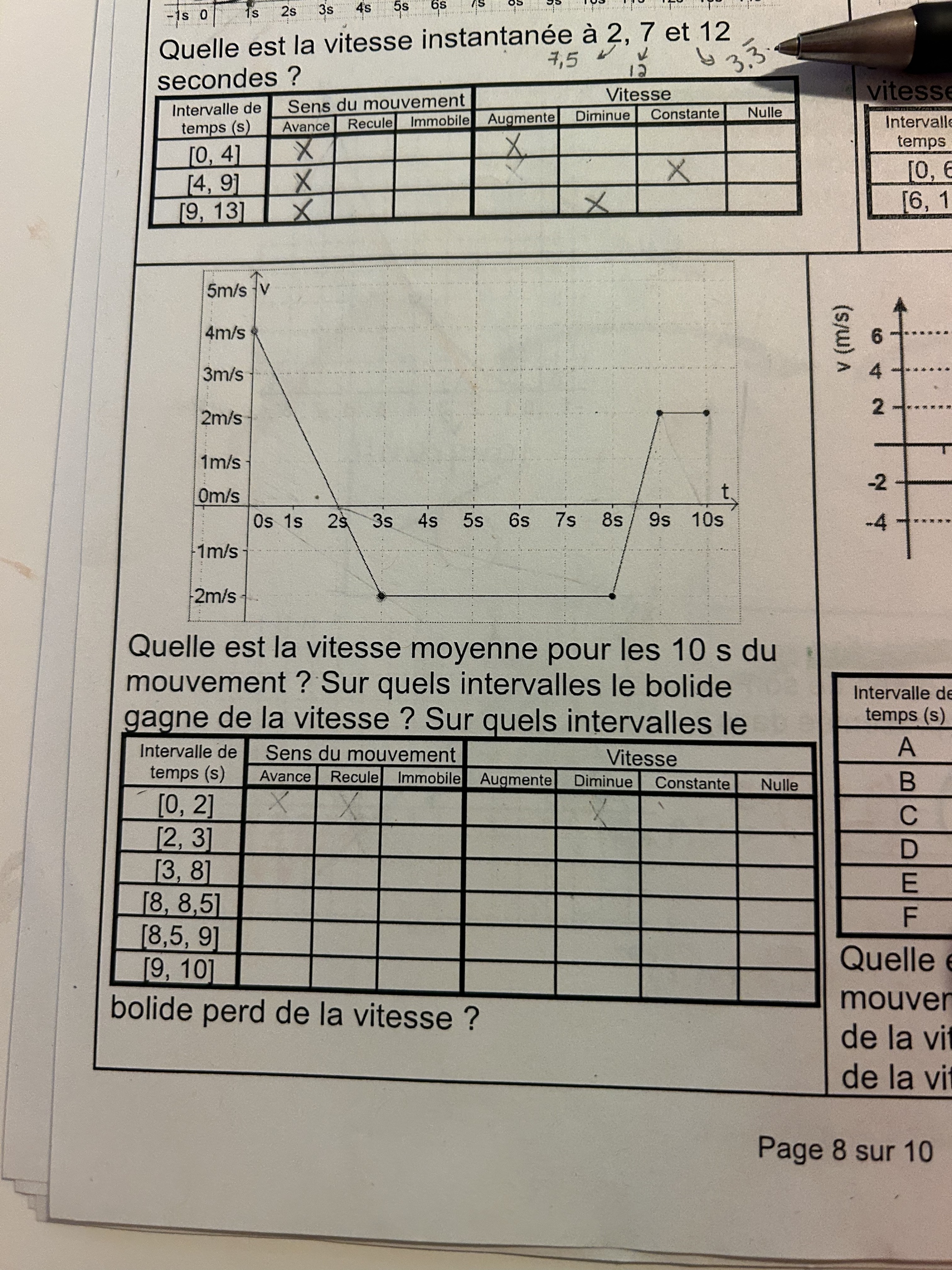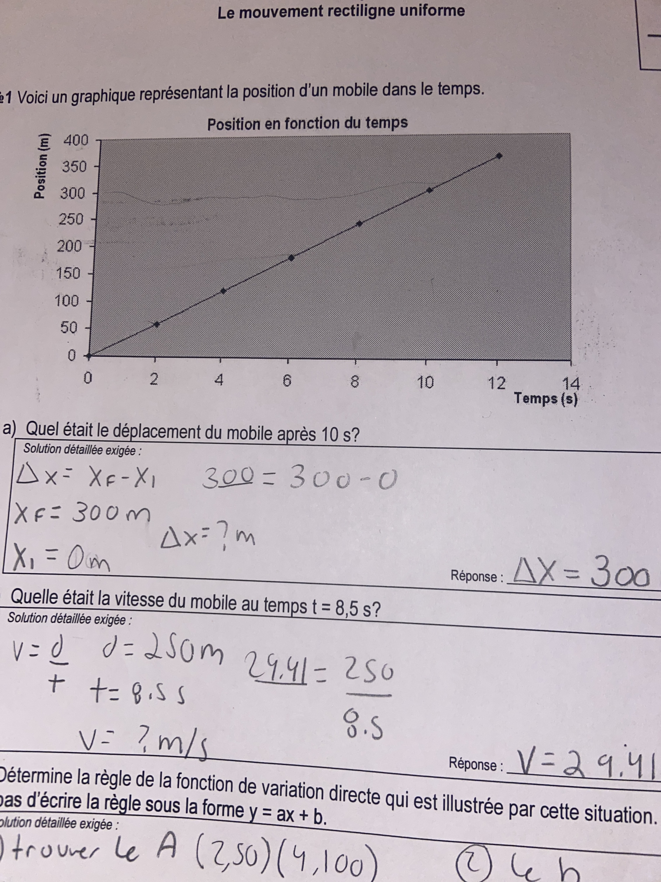 Secondaire 5 • 1acomment je fait pour trouver le deplacement mobile apres 10 seconde et la vitesse mobile au temps 8.5 si le graphique n’a pas de graduation pour savoir quand x vaut 10 y vaut quoi, question b et a