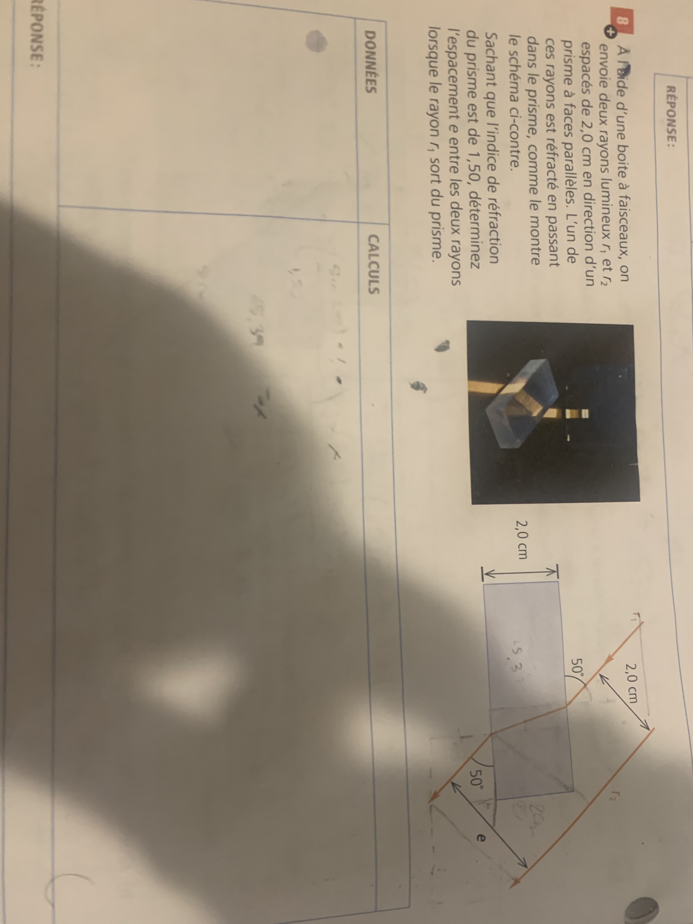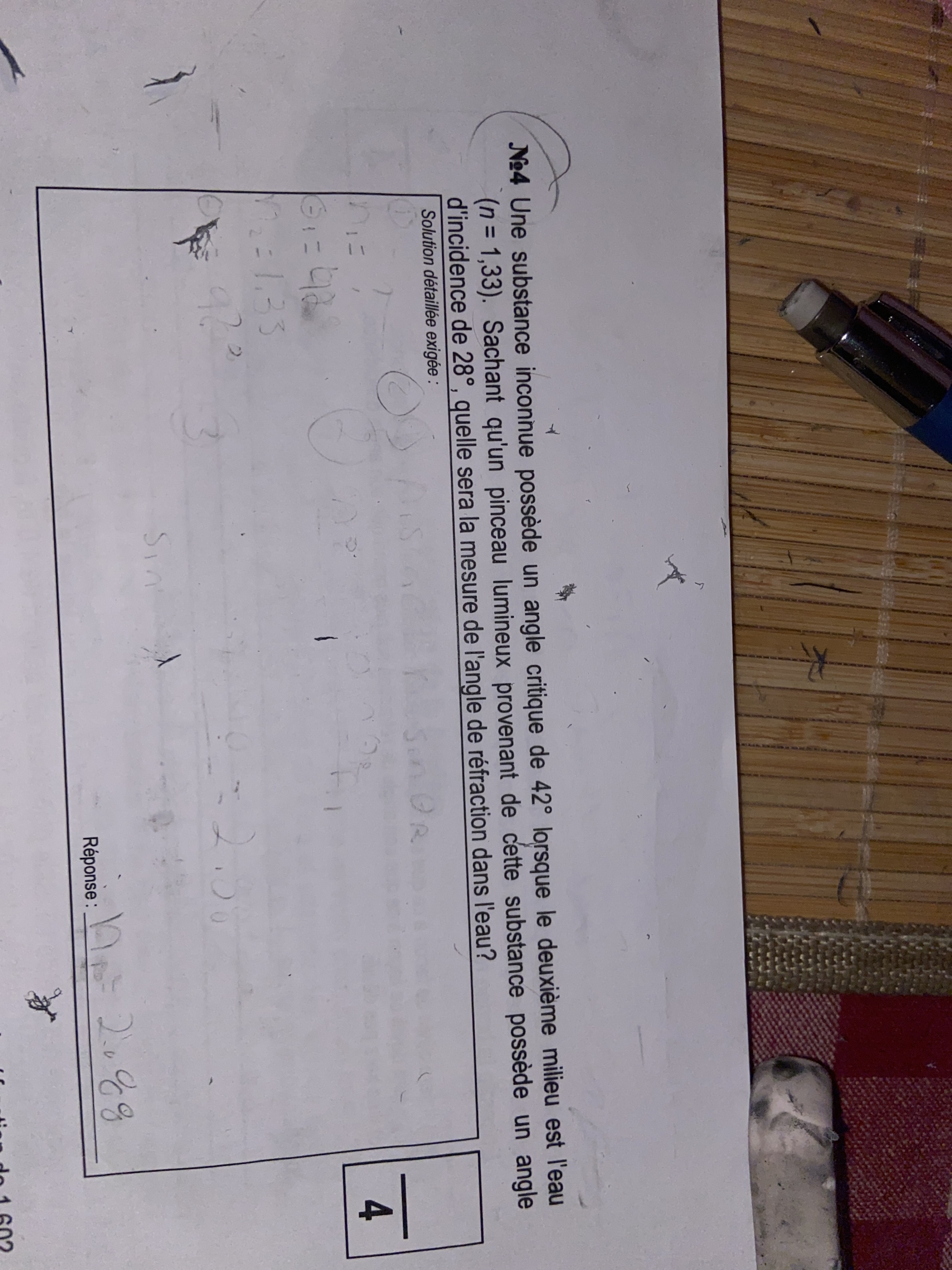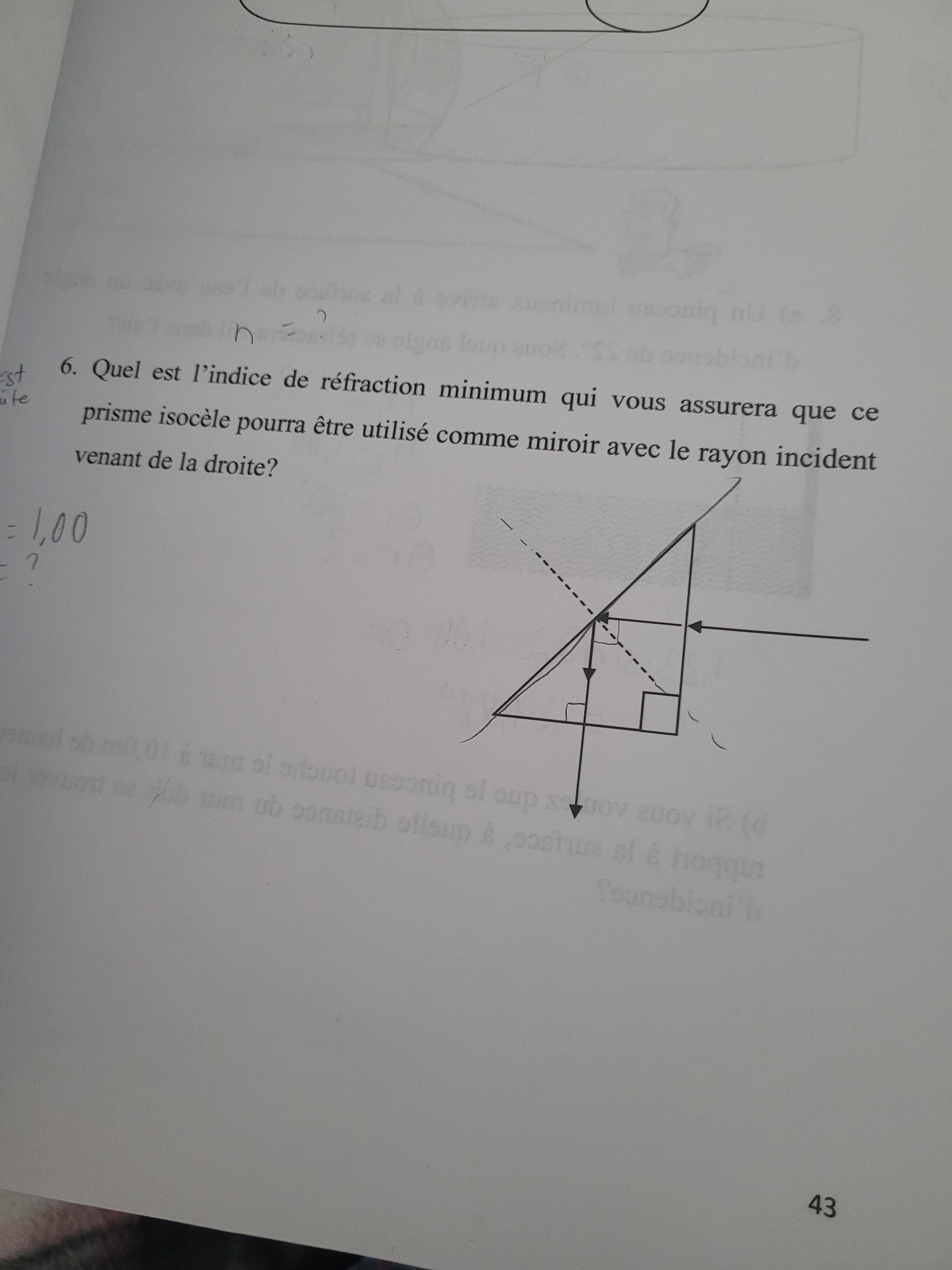 Postsecondaire • 1aUn rayon de lumière voyageant dans l’air touche le centre d’un ¼ de disque de plastique (n = 1,33) tel qu’illustré ci-contre. On désire évaluer l’angle de déviation du rayon à la sortie du ¼ de disque par rapport au rayon initial.Je ne comprend pas quoi faire?