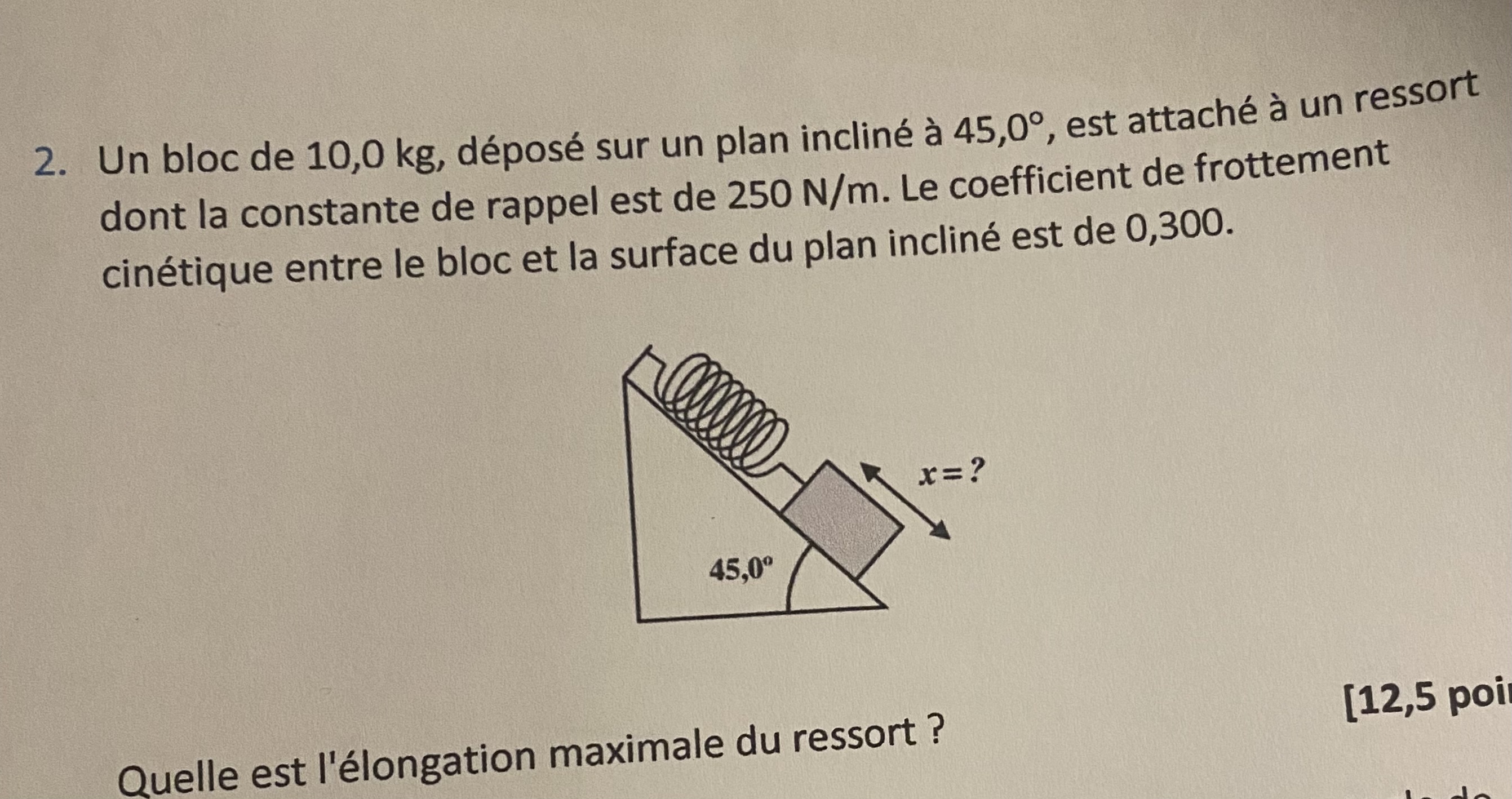 Un bloc de 10,0 kg, déposé sur un plan incliné à 45,0°, est attaché à un ressort dont la constante de rappel est de 250 N/m. Le coefficient de frottement cinétique entre le bloc et la surface du plan incliné est de 0,300. Quelle est l’élongation maximale du ressort ?