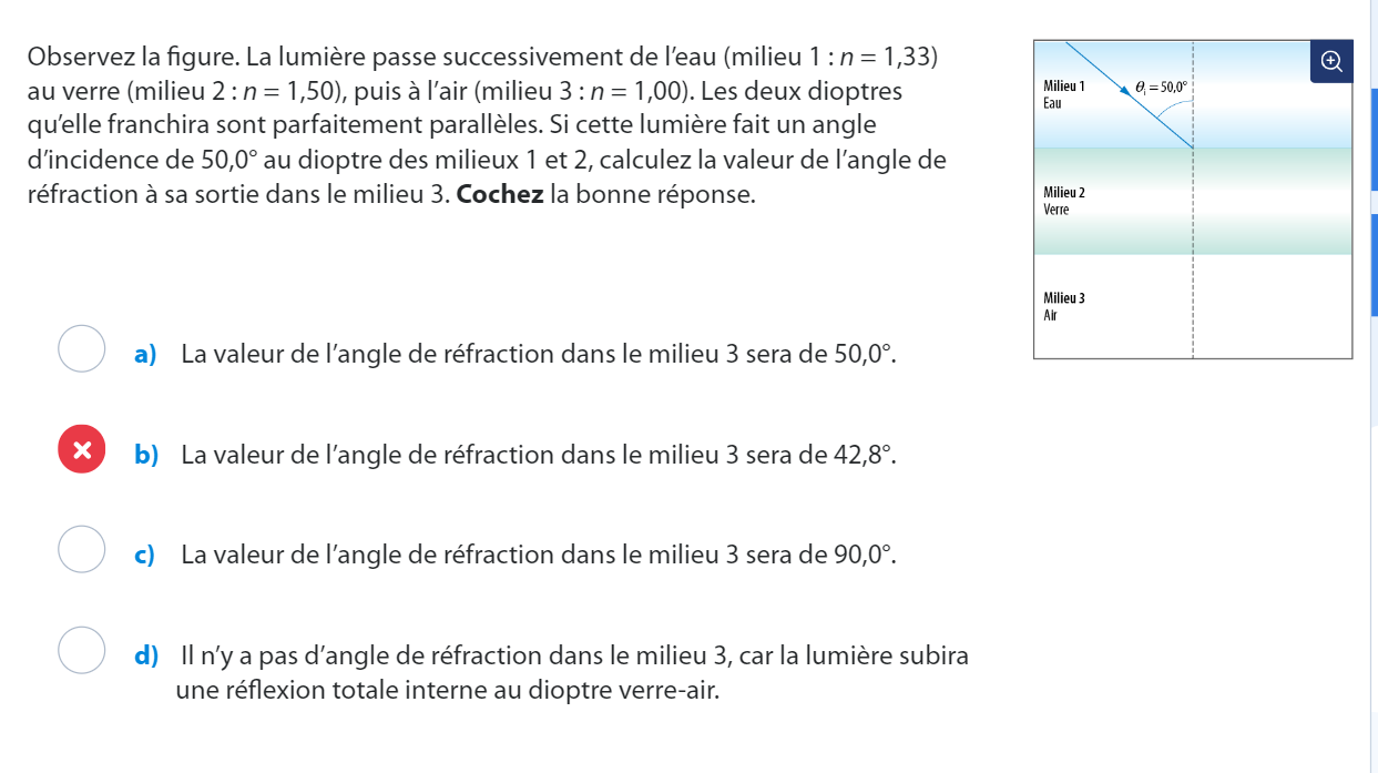 Supposez dix milieux différents juxtaposés, dont les dioptres sont tous parallèles et dont les indices de réfraction sont croissants. Un rayon lumineux présent dans l'air entre dans le premier milieu avec un angle d'incidence de 32,0°. Quel élément permet de déterminer l'angle avec lequel le rayon sortira dans l'air après avoir traversé le dixième milieu ? la réponse c est L'angle d'incidence avec lequel il entre dans le premier milieu