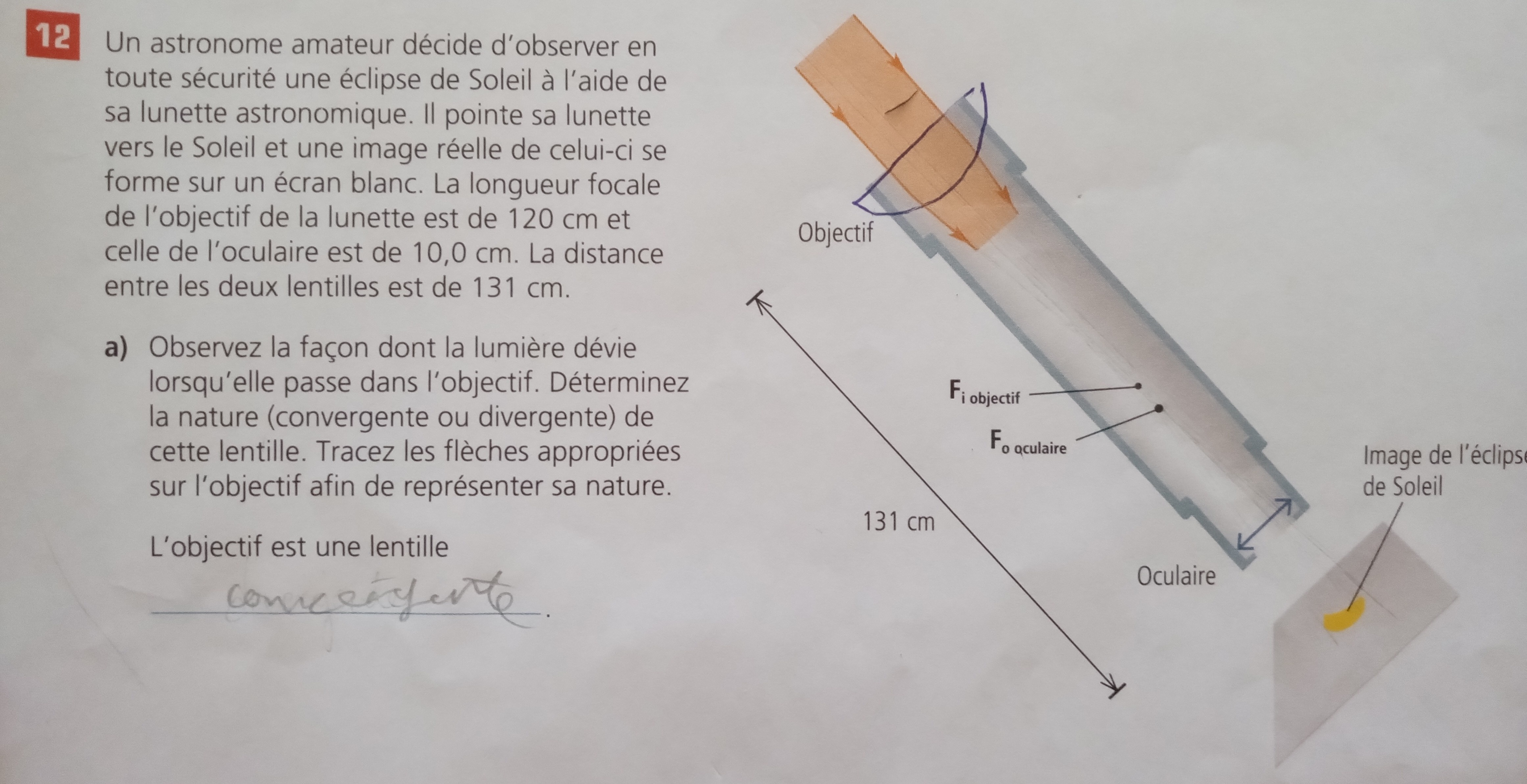 Dans mon exercice, j'ai compris que des rayons du Soleil sont réfractés par une lentille convergente plan-convexe pour se rencontrer au point Fi objectif de la lunette. Puisqu'elle va produire une image réelle, donc inversée, son hi va être négatif. Mais alors si le hi est négatif et que je veux faire un calcul avec la lentille convergente oculaire, l'image produite par l'objectif va devenir l'objet pour l'oculaire, mais un objet ne peut pas avoir un hauteur négative. Que devrais-je faire?Merci !