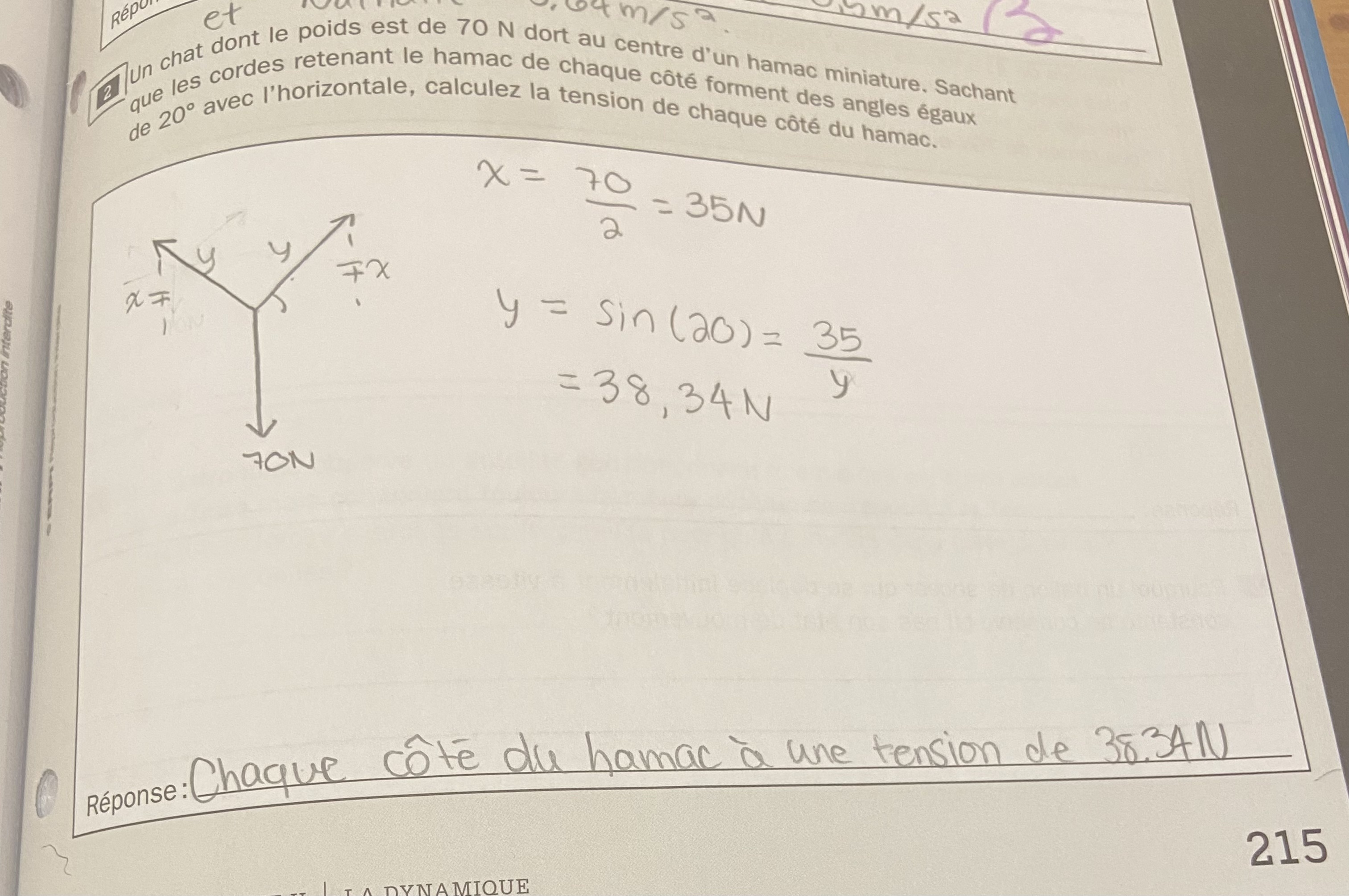 Selon le corrigé, la réponse est 19,5° au-dessus de l’horizontale, mais j’obtiens 12,96° ou 32,04°.