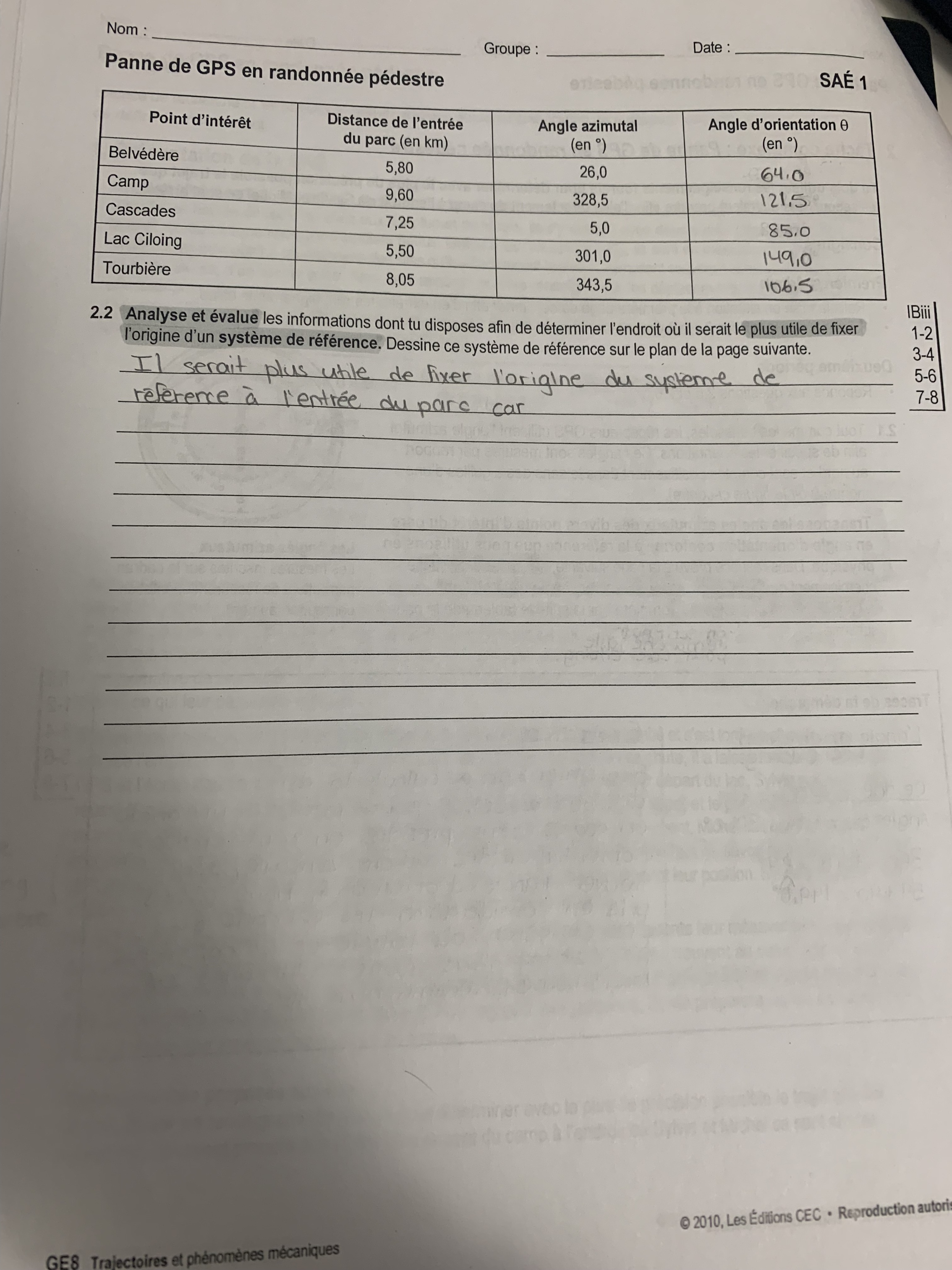Secondaire 5 • 2aComment je pourrais évaluer et analyser (justifier) les informations que je dispose dans le tableau pour déterminer que le meilleur endroit pour fixer l'origine du système de référence est a l'entrée du parc?