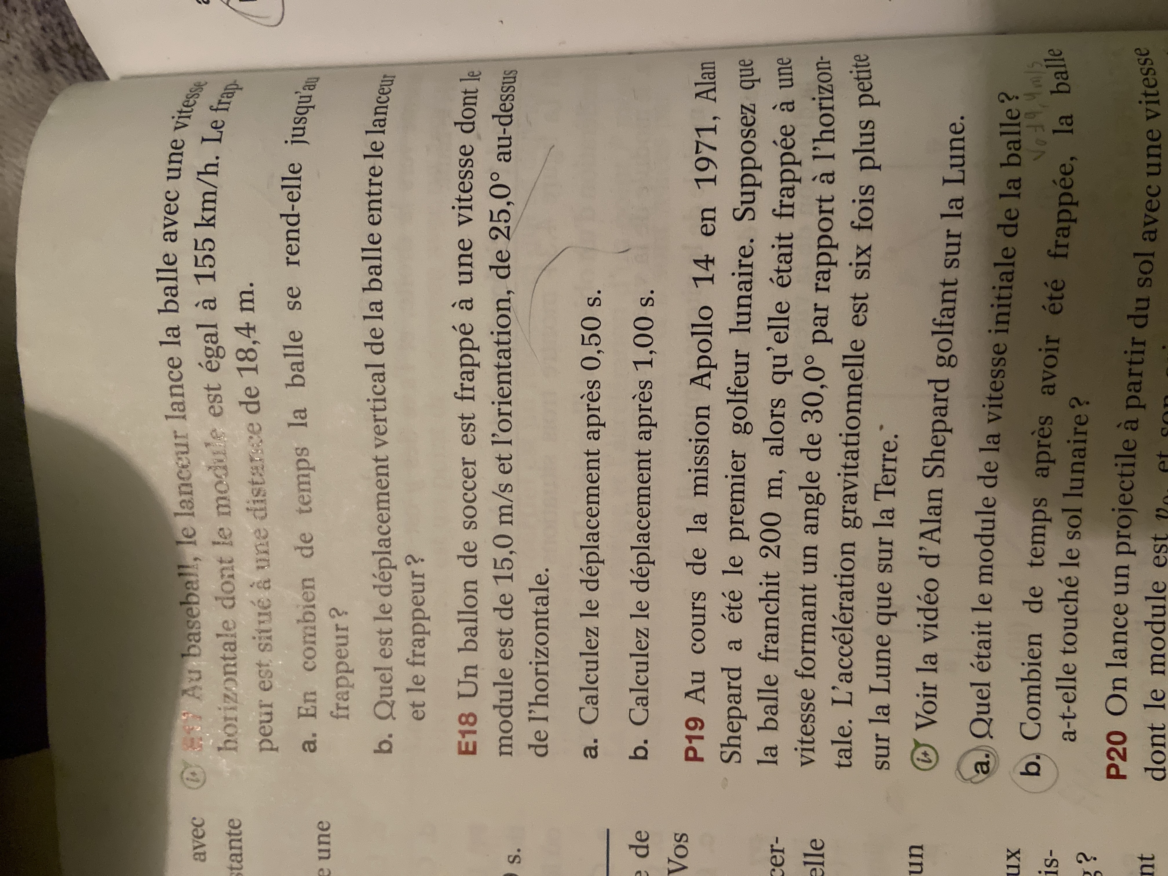 vy = ayt + voy = (-9,8m/s^2) x 4,62s + 25m/s = -20,276m/s, d'où tan-1 (vf/voy) = tan-1 (-20,276m/s) / (25m/s) = à peu près -39° par rapport au sol (en dessous de l'axe des x), mais la bonne réponse est de -25,1° au dessous de l'axe des x.