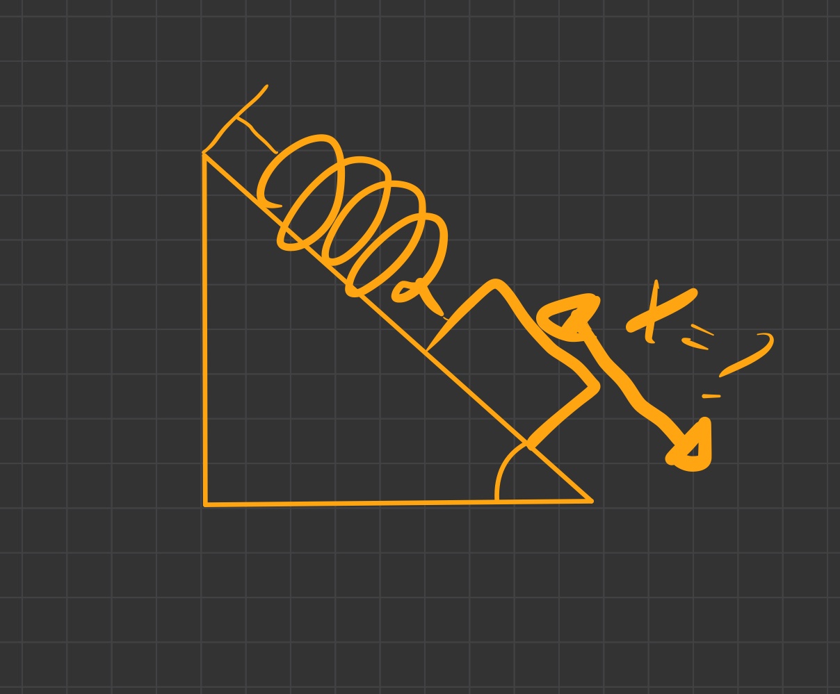 Est-ce que quelqu'un sait comment trouver l'élongation maximale d'un ressort qui est attaché à un bloc sur un plan incliné (voir photo) , si l'angle d'inclinaison, la masse du bloc , la constante de rappel du ressort et le coefficient de frottement cinétique entre le bloc et la surface du plan incliné sont donnés ? Merci !