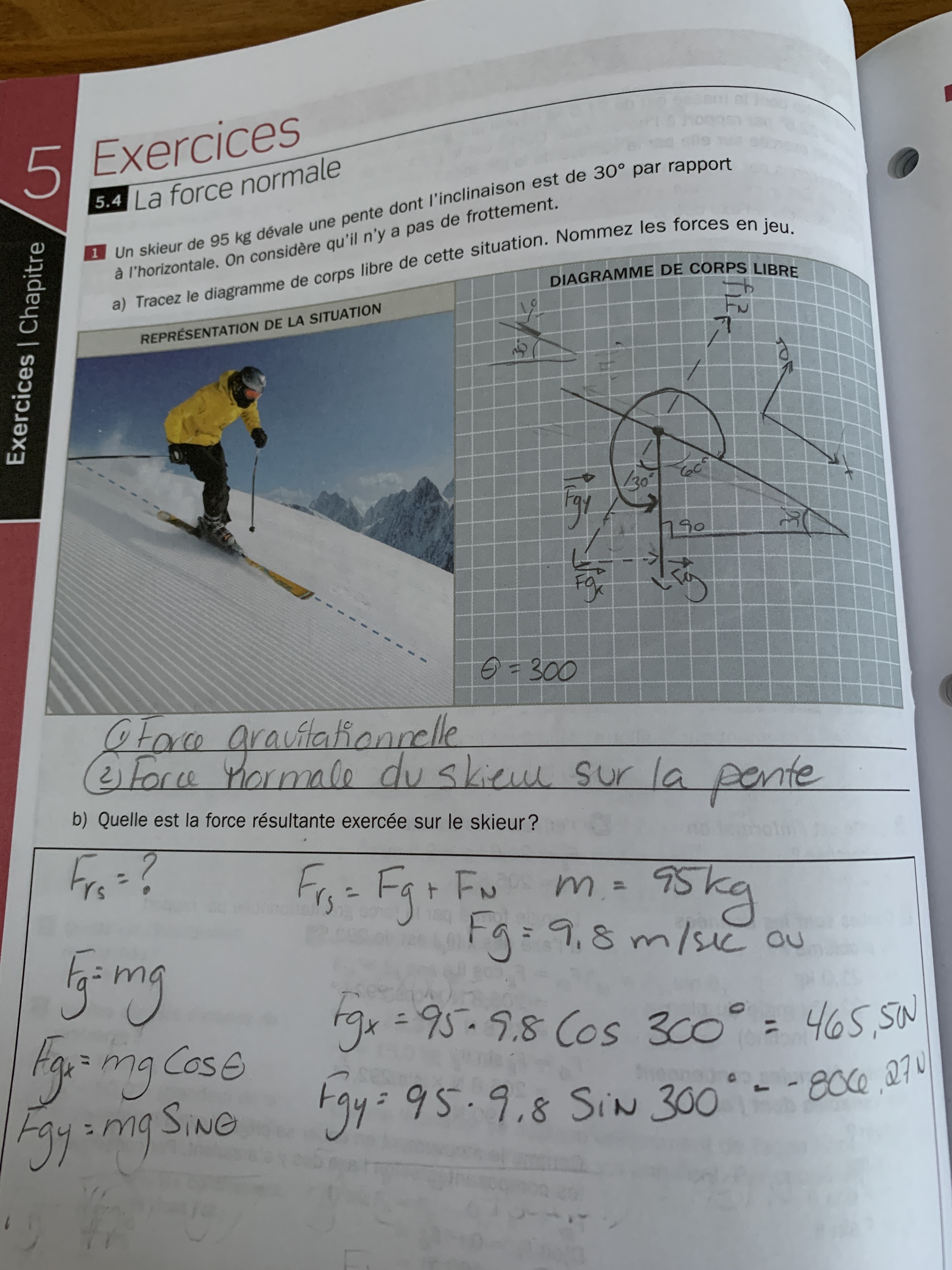 Secondaire 5 • 2aBonjour, je ne comprends ce qu'il cherche dans la question. La force résultante du skieur... donc la force normale? ... j'ai débuté la démarche, mais je suis bloqué dans ma compréhension