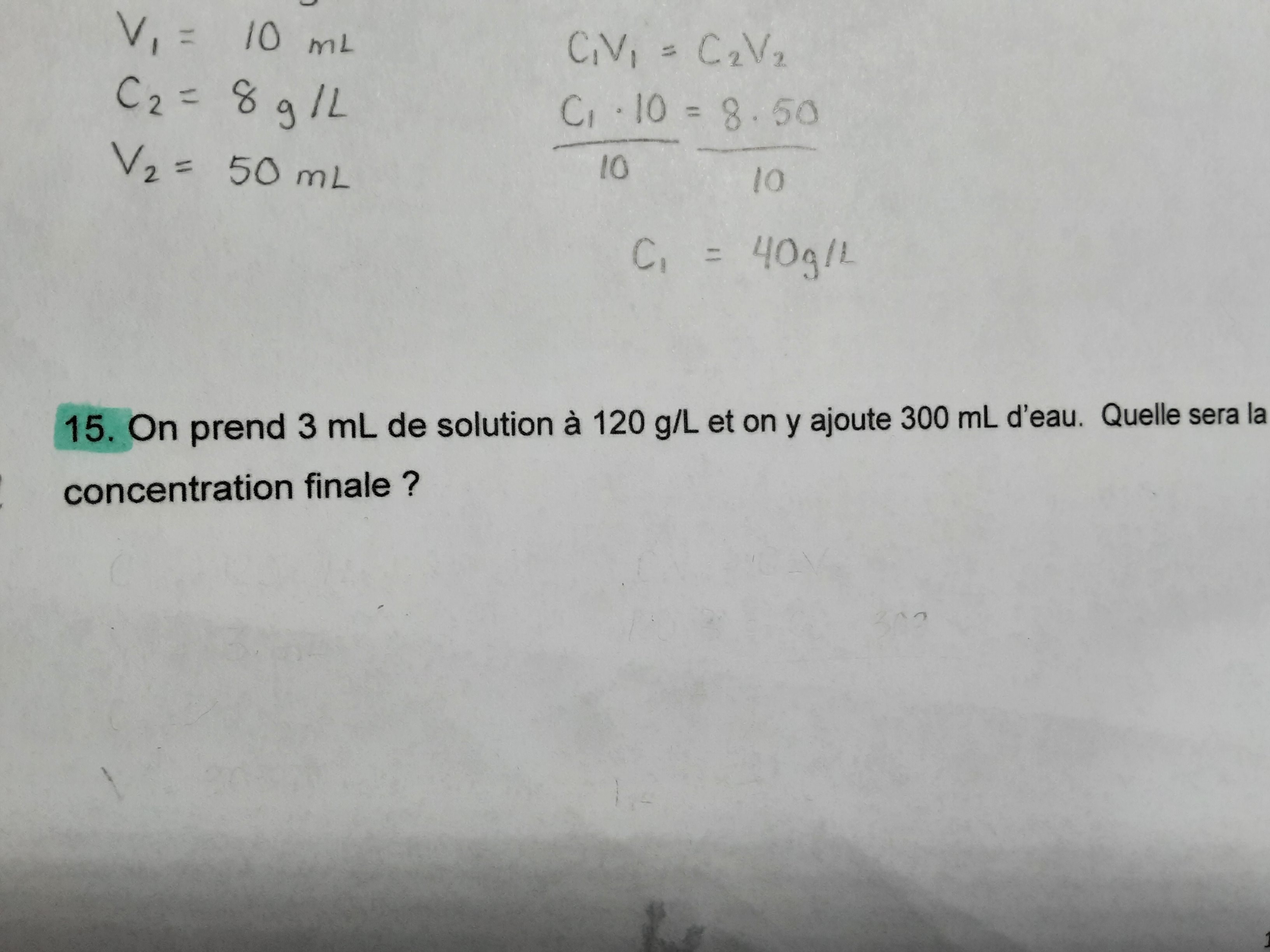 Je ne comprends pas comment faire cette question. On m'a aprise la formule C1V1=C2V2, mais je ne suis pas certaine si c'est ça que je dois faire ici.