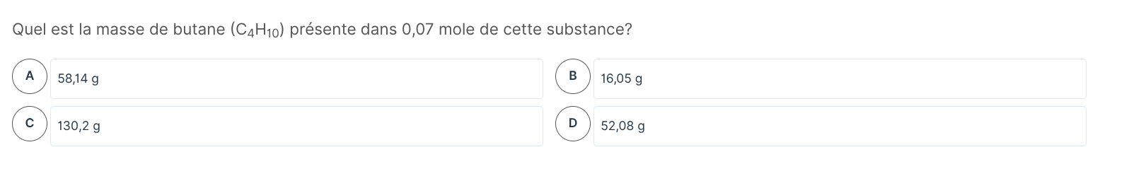 Secondaire 4 • 2mBonjour, je suis pratiquement sûre que la réponse à cette question est 4,0698g, mais ce n'est pas dans les choix. J'ai fait m=M x n, donc m= (12,01x4+1,01x10) x 0,07, donc m=58,14 x 0,07 = 4,0698g. Ai-je fait une erreur quelque part?