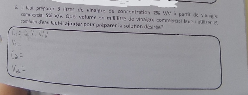 Secondaire 3 • 2mBonjour, je ne comprends pas comment résoudre cette situation, car je ne sais pas vraiment quoi placer où (Qu'est ce que le C1, V1, C2 ,V2). Est ce que quelqu'un pourrait m'aider? Merci :)