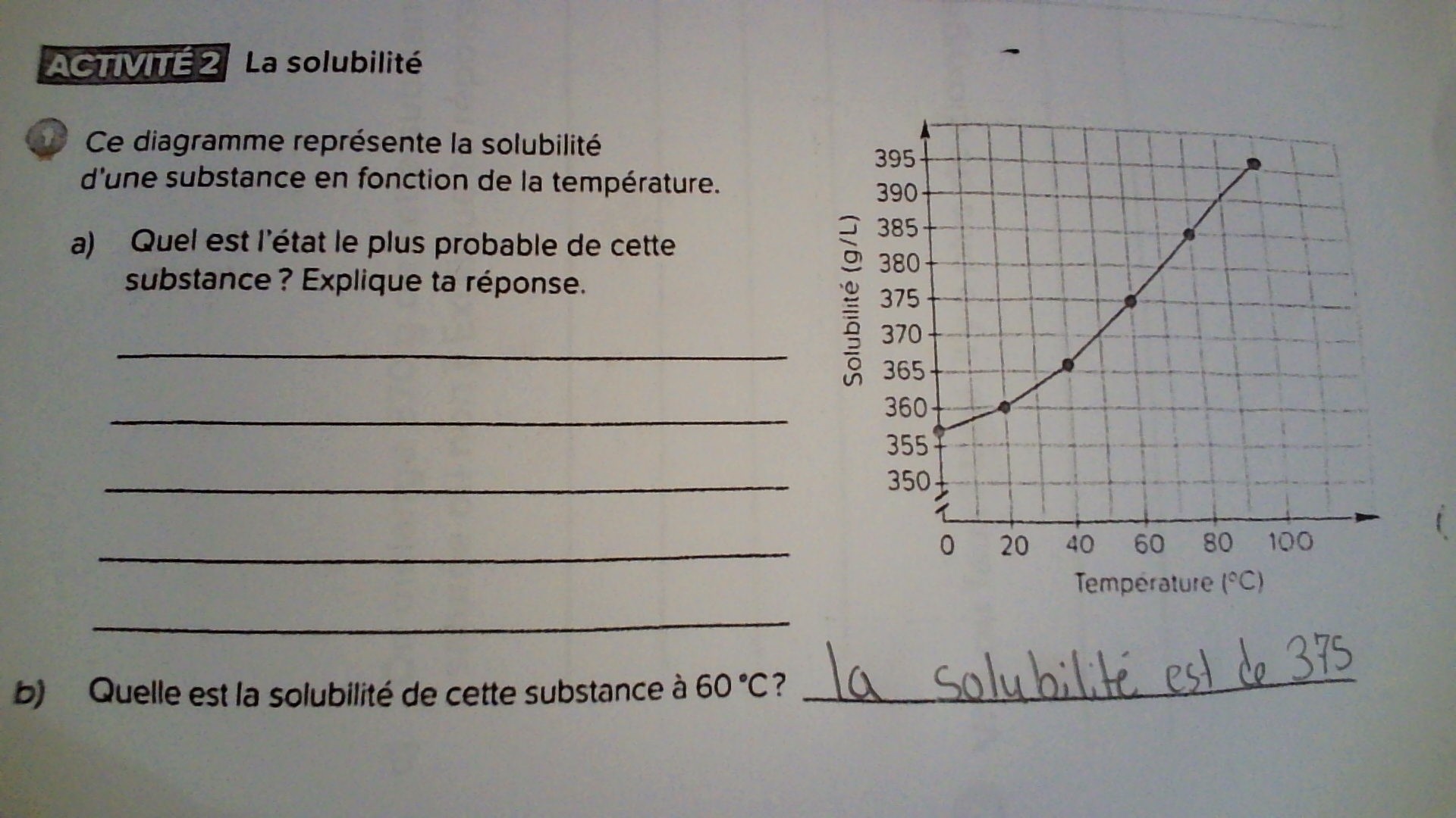 Secondaire 3 • 2mOn mélange 370g de cette substance dans 1L d'eau a 25 Degrés Celcius. La solution obtenue sera-t-elle saturée ou non ? je ne sais pas comment trouver ça merci de m'aider