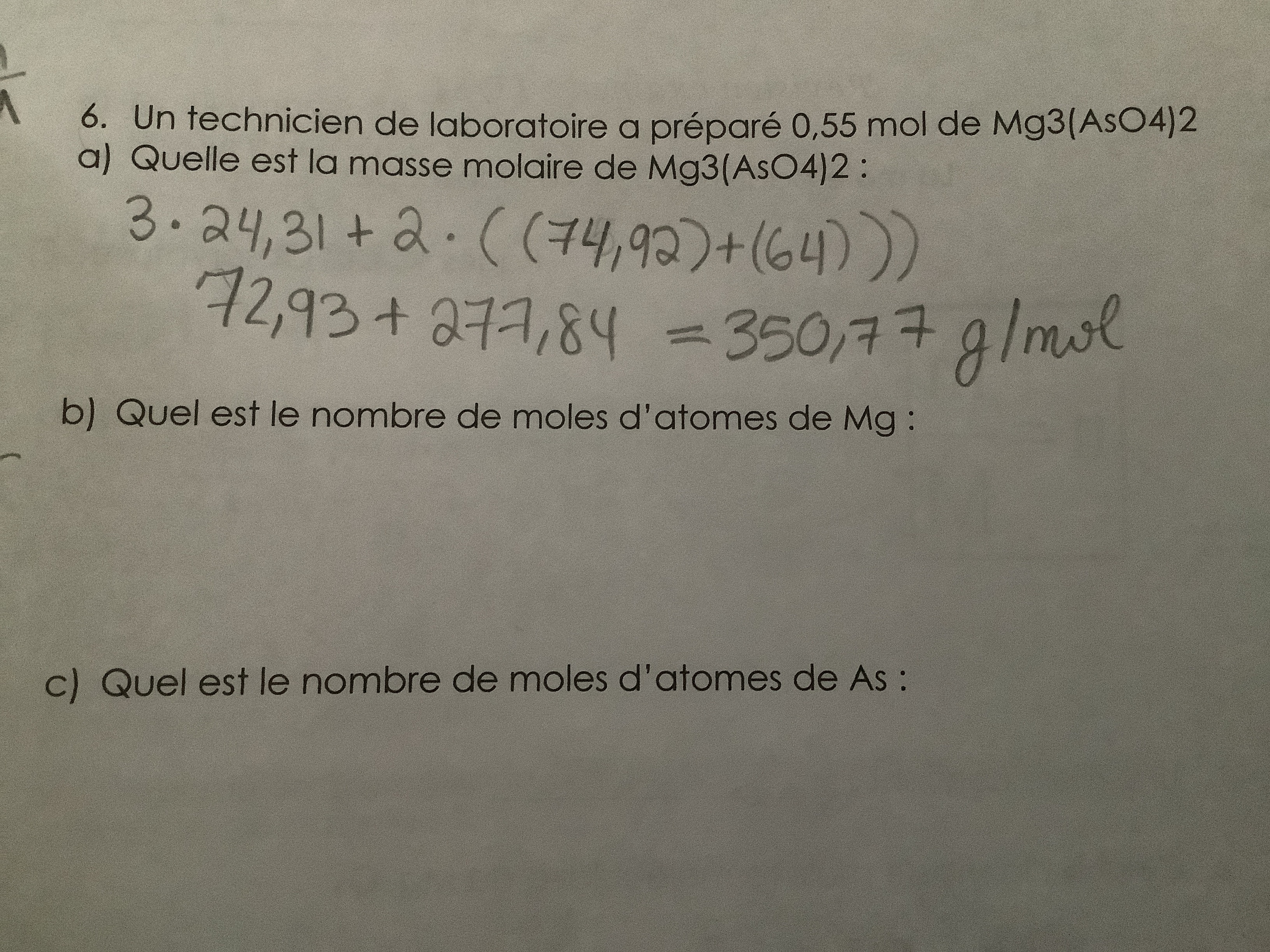 Secondaire 4 • 2mBonjour, je fais un exercice sur la mole et on me demande de trouver le nombre de moles d’un atome en particulier dans une molécule dont le nombre de moles est déjà donné. Cependant, je ne vois pas comment trouver le nombre de moles de l’atome à moins qu’il soit identique à celui de la molécule en question?