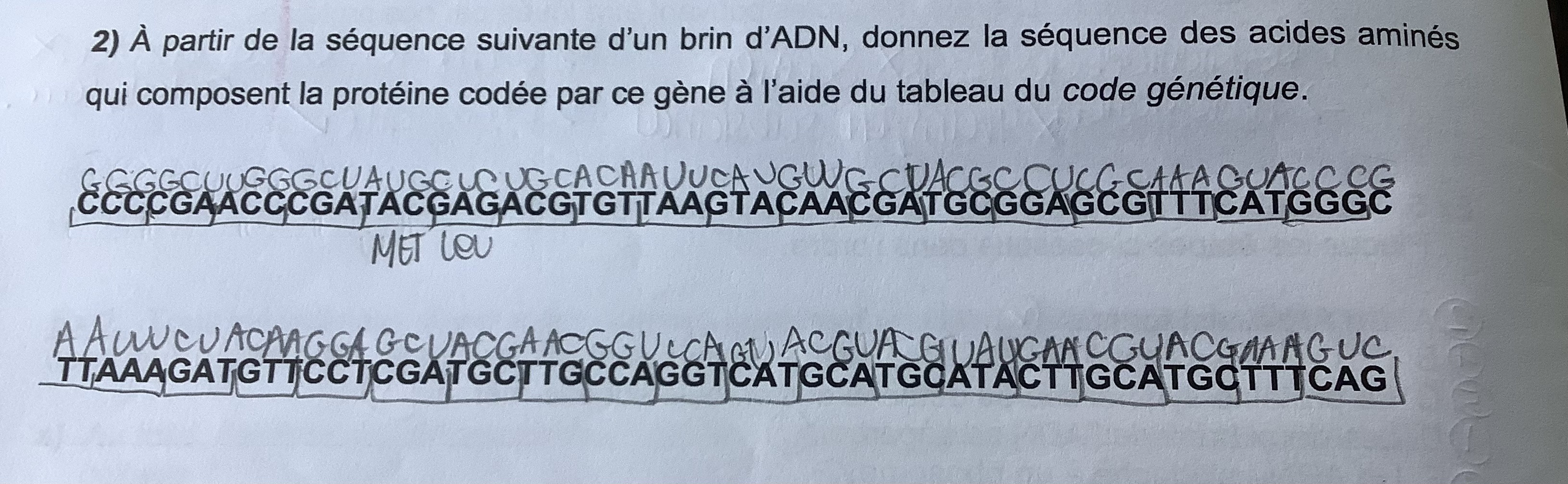 Secondaire 4 • 5mEst ce que dans cet exercice on commence la traduction de AUG? Et on finit au premier UAA, UAG ou UGA qu'on rencontre ou bien il faut analyser depuis GGG jusqu’à GUC? Merci