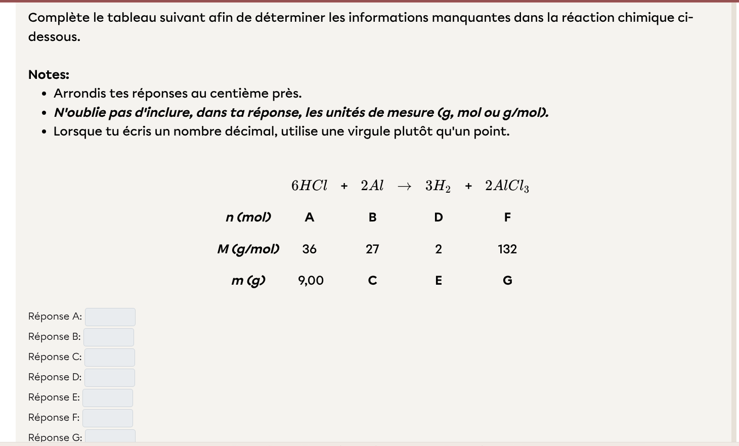 Secondaire 4 • 6mBonjour, je faisais des exercices sur la stoechiométrie pour me préparer pour mon exam de STE, mais je n'ai pas compris comment faire ce numéro sauf pour le A.