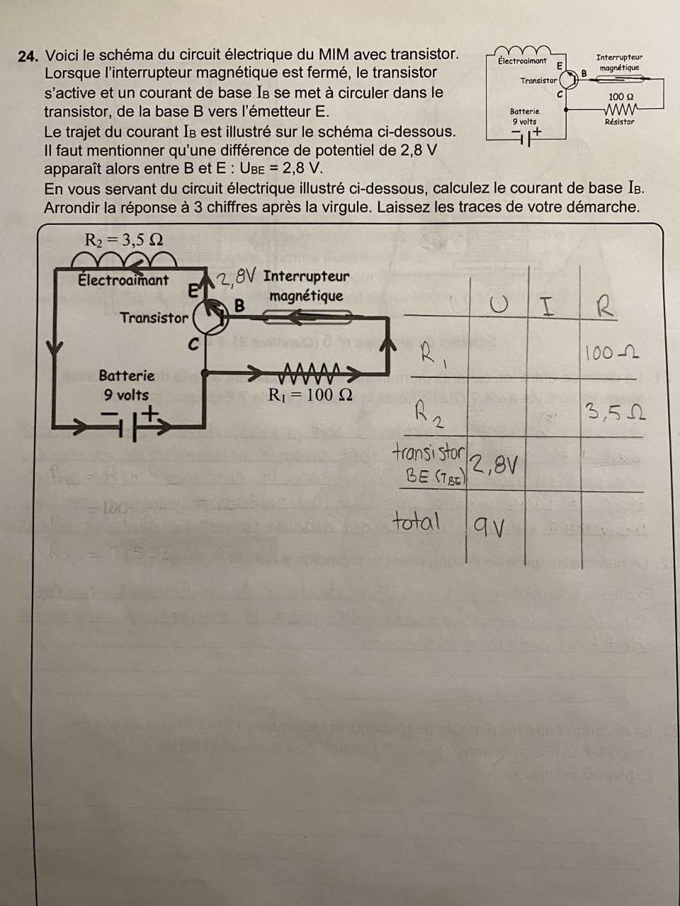 Secondaire 4 • 3aBonsoir, je n'ai pas bien compris l'influence d'un transistor dans un circuit électrique et comment calculer la tension, l'intensité de courant ainsi que la résistance impliquant un transistor. Voici mon problème et ce que j'ai commencé, des pistes?