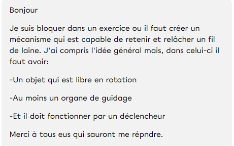 Malheureusement, j’ai de la difficulté avec le module technologique en science, dans le sens que, je n’arrive pas à bien comprendre ou maîtriser plusieurs sujets, comme par exemple, les liaisons et les guidages (je n’arrive pas à mémoriser les dessins pour chaque chose comme rotation,translation, etc…), les machines simples, les forces et les mouvements, le fonctionnent d’un système (intrants,extraits,fonction globale, procédés, commandants), etc… Aussi, lorsqu’on me montre un objet et qu’il faut expliquer son fonctionnement en nommant l’énergie, la/les force(s) et les mouvements utilisés en plus de préciser le sens (horaire,anti horaire) et d’autres choses, j’ai beaucoup de difficulté avec l’explication. Non seulement j’ai énormément de difficulté avec l’explication dans un examen théorique, mais j’ai, également, des problèmes avec la compréhension des exercices et je tombe souvent pour les pièges ce qui résulte à ce que je perds beaucoup de points facilement.