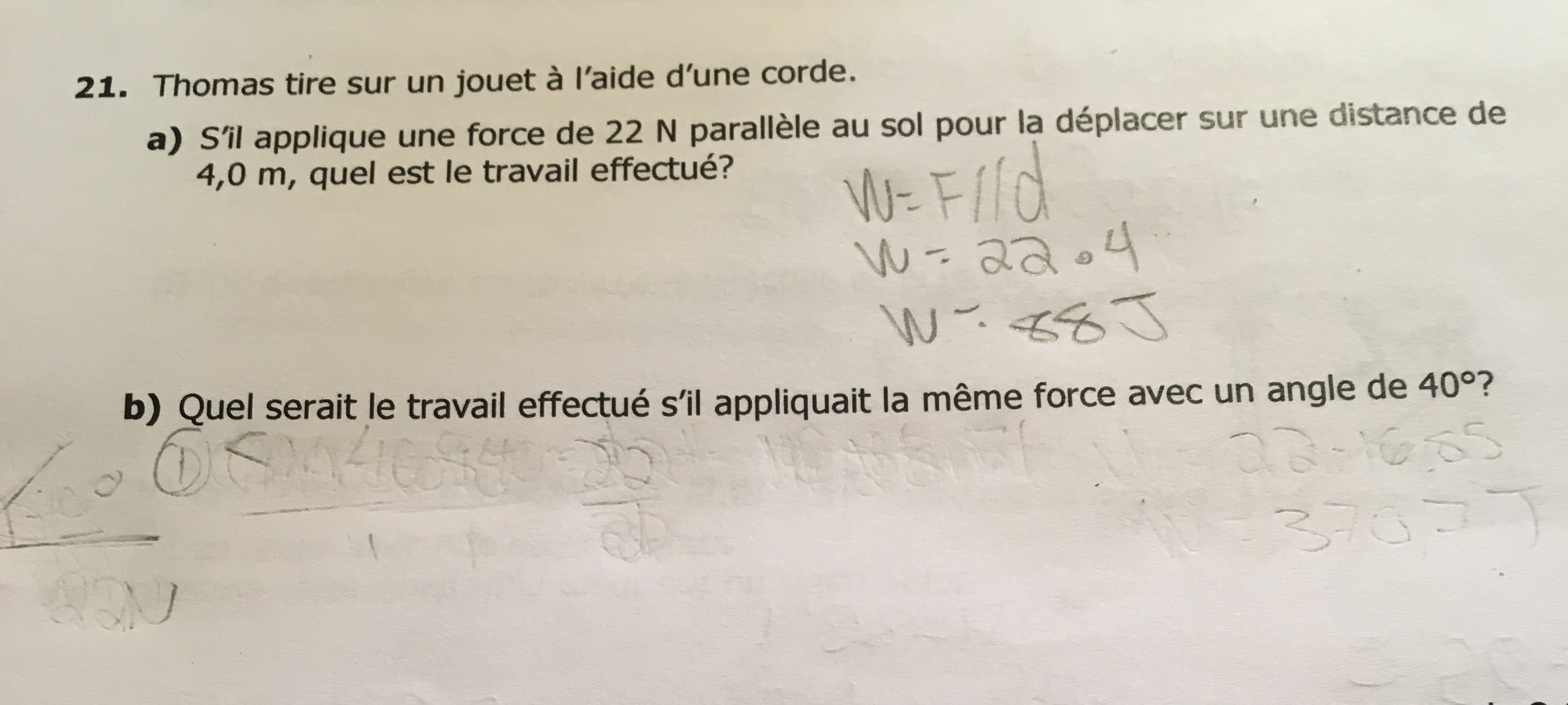 pour cette question, est-ce que je le calcule comme W=Eeff x déplacement x cos degré de l’angle où plutôt comme W=Eeff x déplacement x (180 - cos degré de l’angle)?