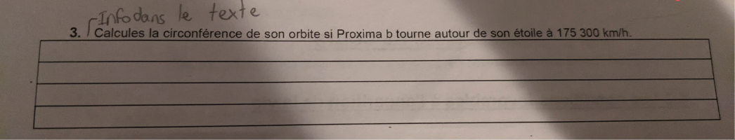 Secondaire 3 • 4aJ'arrive pas a comprendre il me faut quoi pour ce numéro? (Mise en contexte c'est un texte sur Proxima B). En gros je sais juste pas quoi chercher comme info et je sais pas comment commencer! Merci pour l'aide d'avance.