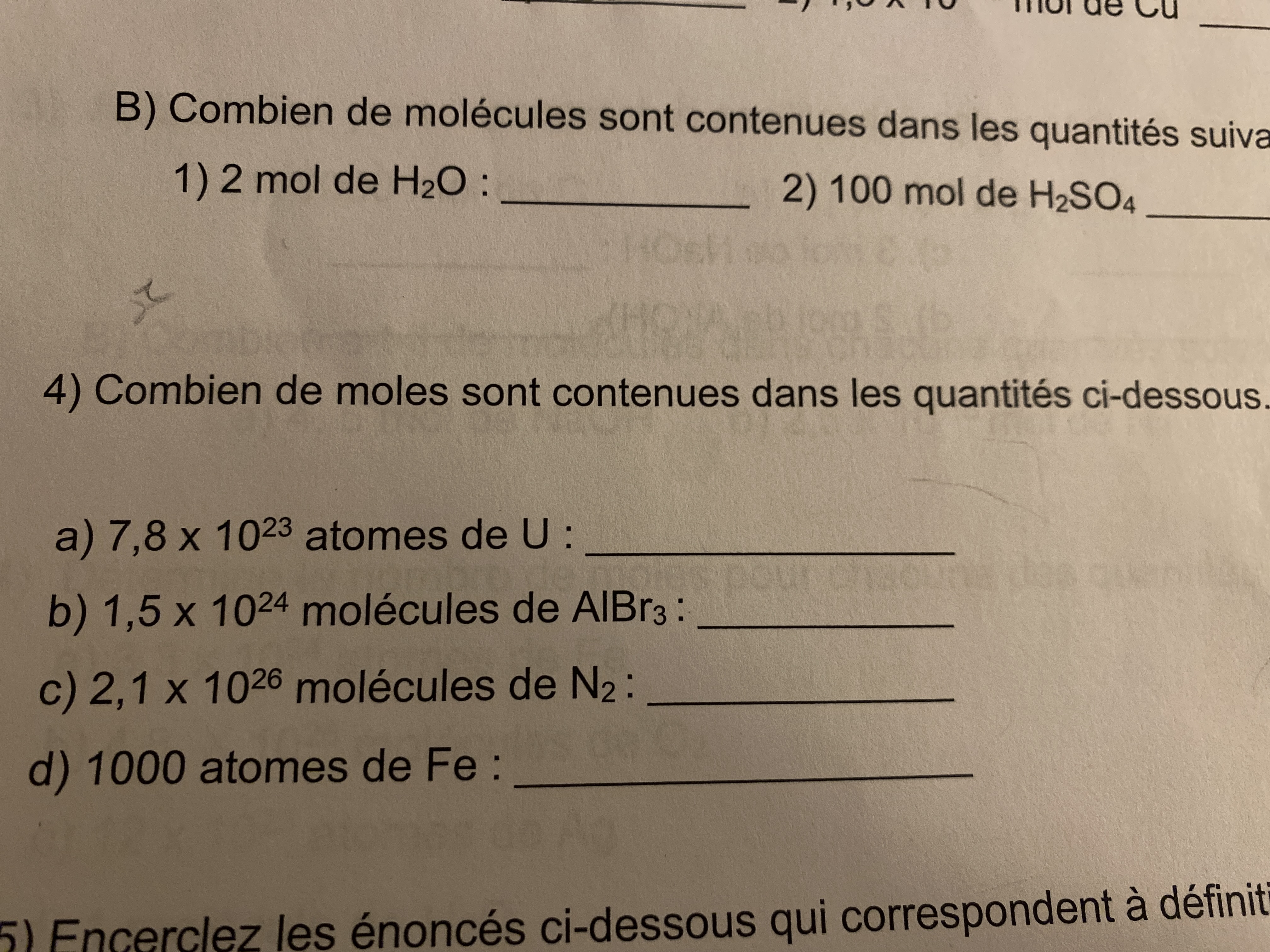 Secondaire 4 • 4aBonsoir! Je suis dans le cours Science et technologie de l’environnement (STE ou Science forte) et présentement nous somme dans la notion de mole. J’ai un paquet de feuille à remettre demain, mais il y a une question que je ne comprend pas (numéro 4)