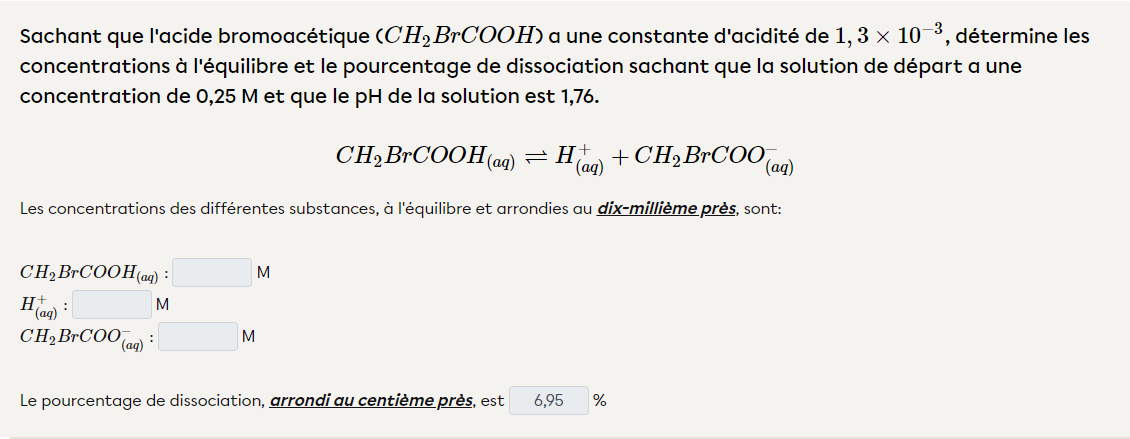 Secondaire 5 • 4aComment calculer le pourcentage de dissociation ?ici j'ai trouver 6,95% mais ça dit c'est faux.