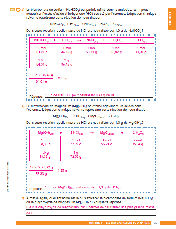 Est-ce que la bonne réponse dans le c de cette question s'agit du dihydroxyde de magnésium à cause qu'il a 2 moles de HCl dans son équation chimique comparer au bicarbonate de sodium qui en a seulement 1 seule?Merci et bonne journée! :)